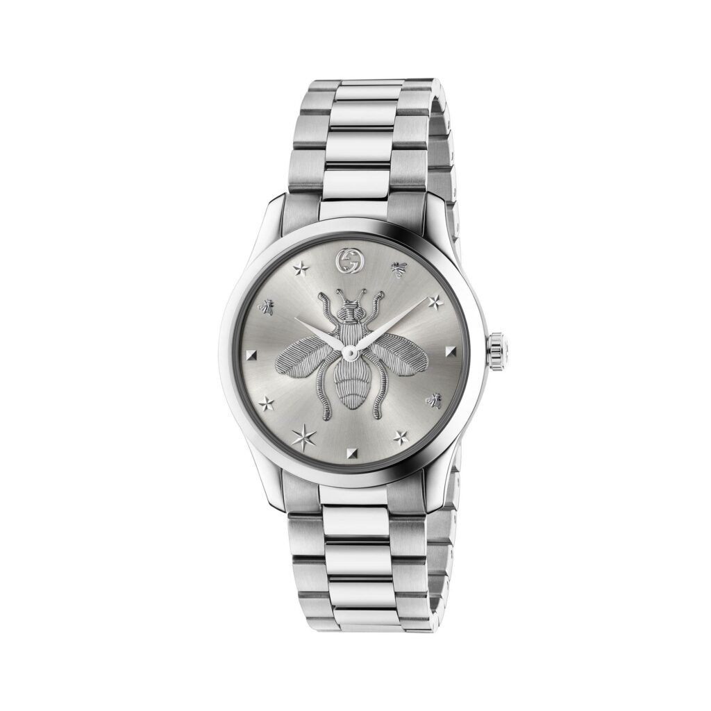 - Silver tone dial with the Gucci bee in the centre