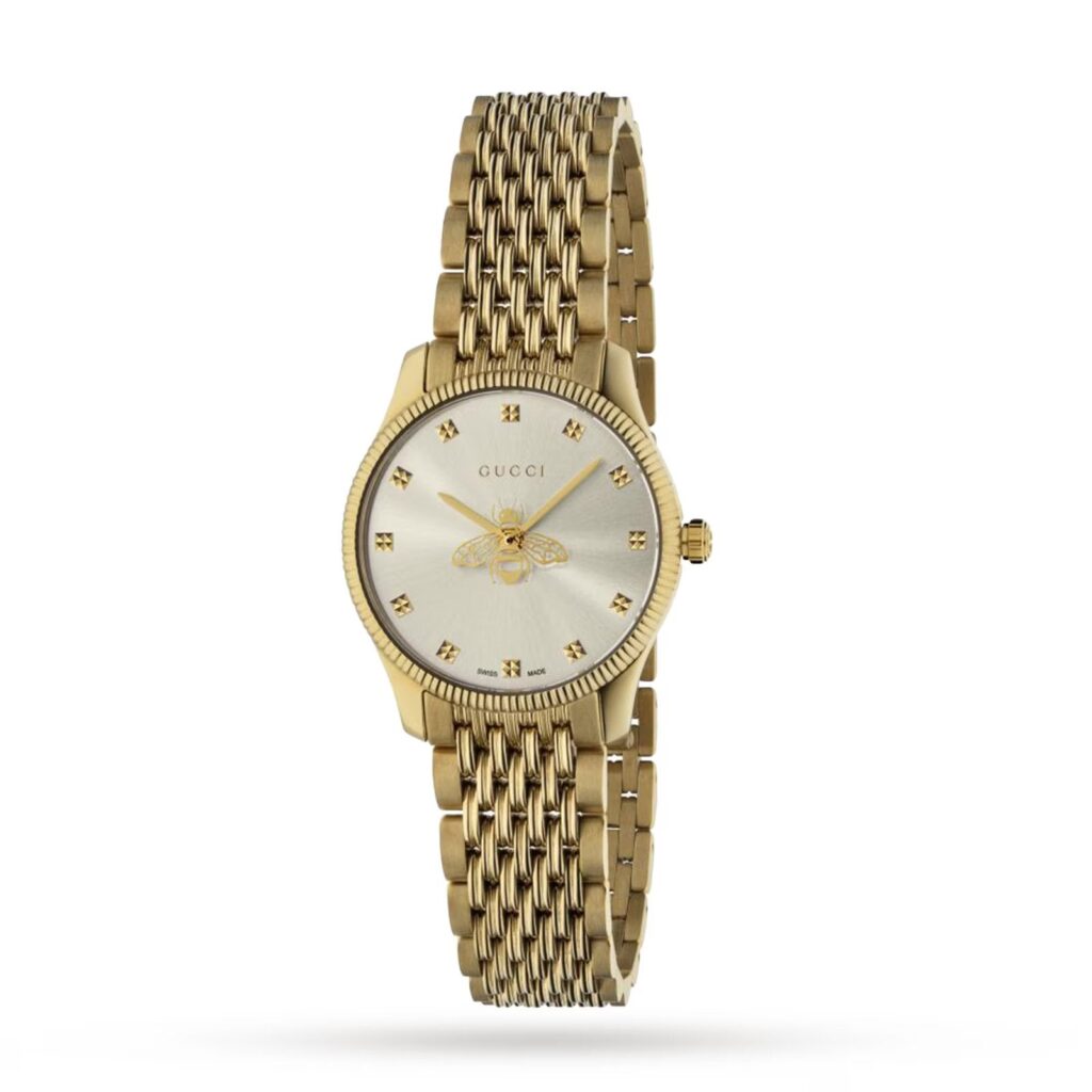 - Silver Guilloché Dial – Decorated with **Gucci’s iconic bee motif markers** for a distinctive luxury touch.