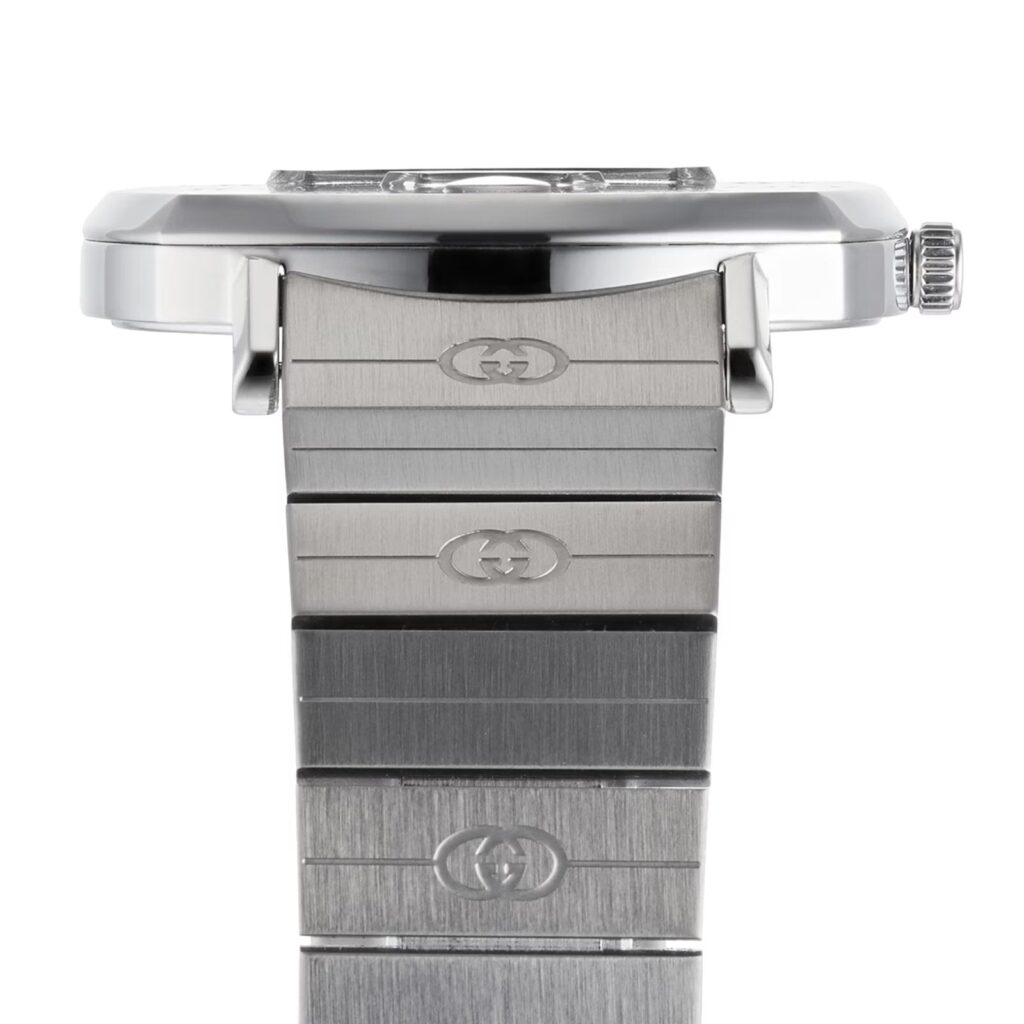 A clean, streamlined design that fits snugly around the wrist, the Grip watch takes its inspiration from the world of skateboarding, its name recalling the way the rider’s sneakers stick to the grip tape on a skateboard. The stainless steel face has three windows to display the hour, minute and date, completed with a matching bracelet with engraved Interlocking Gs. Steel case with engraved Interlocking Gs, 3 windows indicating hour, minute and date, steel bracelet with Interlocking Gs The warranty certificates for Gucci watches purchased after March 1st 2022 are exclusively available online. Download your certificate at https://watchwarranty.gucci.com by using the serial number engraved on the back of your watch. Quartz movement Water resistance: 3 ATM (100 feet/30 meters) YA157401 Swiss Made Your Grip watch will arrive in a special edition floral jacquard topped packaging, available in a range of four different motifs inspired by the world of Gucci ready-to-wear. Further accentuated by a delicate gold floral pattern, the box will be individually selected for your watch and comes with a velvet pillow for product storage.