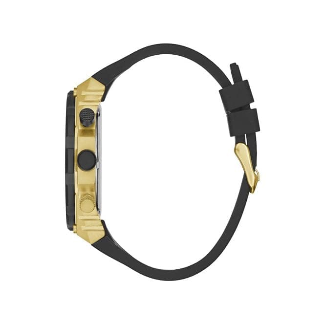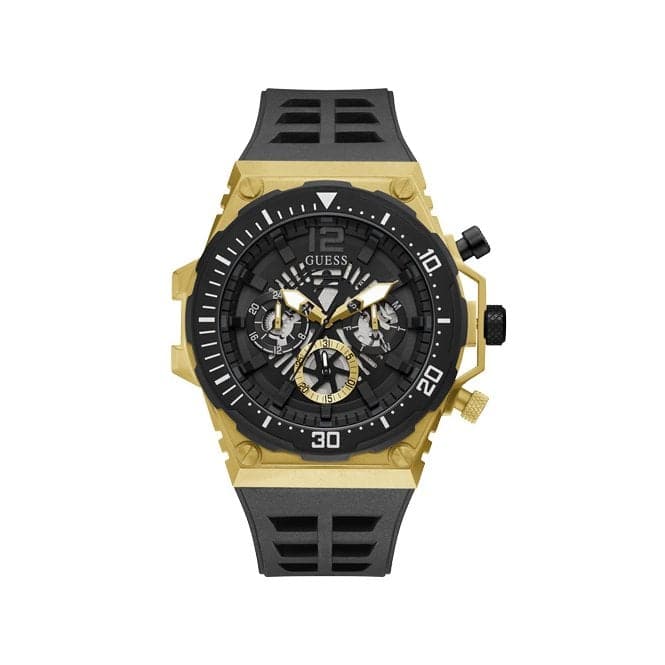 Guess Gents Watch With Brushed Gold Case, Black/Champagne Multi Function Dial, Black Textured Silicone Strap