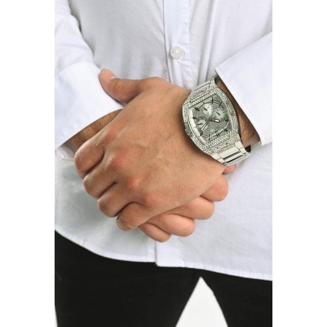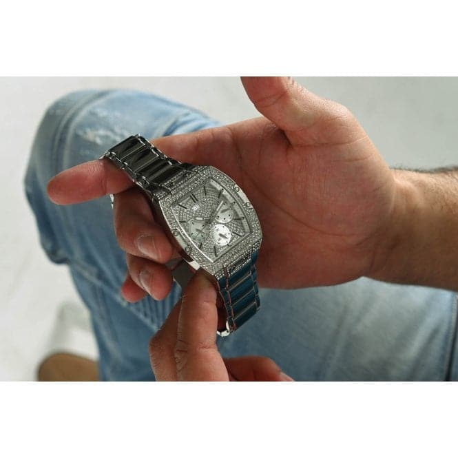 GUESS Gents watch with polished silver case with crystals, sunray silver glitz multi-functional dial, polished silver bracelet