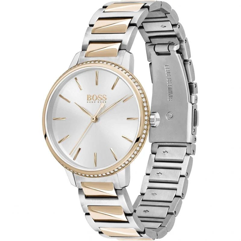 The Hugo Boss 1502567 Signature Watch is a sophisticated and functional timepiece designed for women. This watch features a two-tone stainless steel bracelet, combining a polished silver-tone case with rose gold-tone accents, creating a refined and luxurious look. The silver dial is adorned with crystal-set markers and rose gold-tone hands, providing elegance and readability. This stylish watch is perfect for both casual and formal occasions, offering durability and classic design.