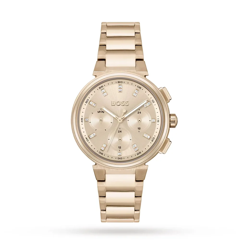 The Hugo Boss 1502592 Pandora Gold-Tone Stainless Steel Watch is a perfect blend of luxury and modern design. This elegant timepiece features a stunning gold-tone stainless steel case and bracelet, offering a rich and refined look. The deep black dial is beautifully accented with gold-tone hands and hour markers, providing a striking contrast. The bezel is adorned with sparkling crystals, adding a touch of glamour to this sophisticated watch. With three sub-dials displaying the day, date, and 24-hour time, this watch combines style with practicality. Ideal for both formal occasions and everyday wear, the Hugo Boss Pandora watch is a versatile accessory for the contemporary woman.