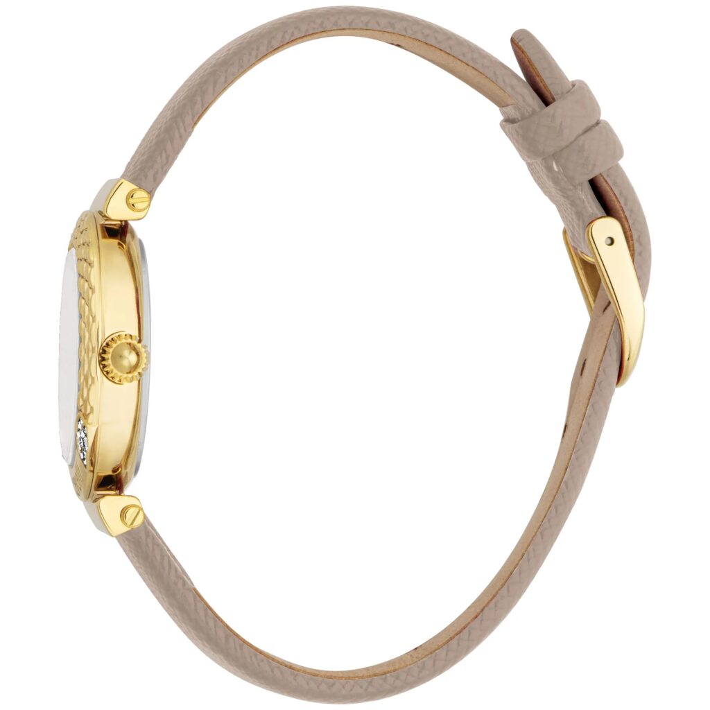 Ignite a sophisticated aura with a sleek, luminous gold watch featuring a textured silver dial and shimmering zircon stones that catch the light. Its smooth leather strap in refined silk grey contours effortlessly around the wrist, evoking a tactile sensation of luxury and movement. Designed for urban elegance and daytime charisma, it promises to elevate your style with a touch of polished serenity that suits any contemporary occasion.