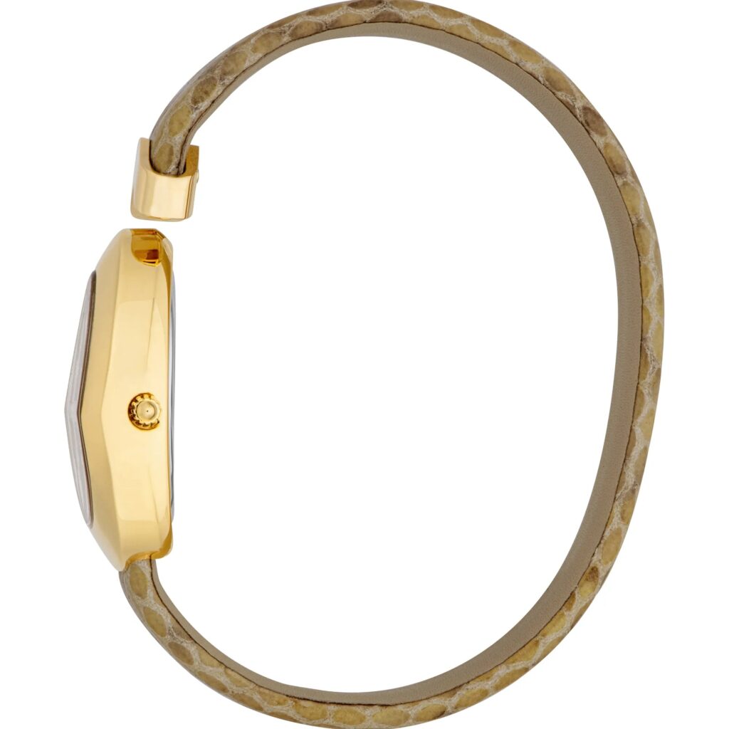 Ignite a captivating aura with a sleek, oval watch in lustrous yellow gold and creamy mother of pearl. Featuring shimmering zircon stones that dance in the light, it offers an exquisite tactile sensation with every glance. Bright, sophisticated, and versatile, it’s crafted for urban elegance and effortless style during sophisticated evenings or daytime adventures with a chic edge.