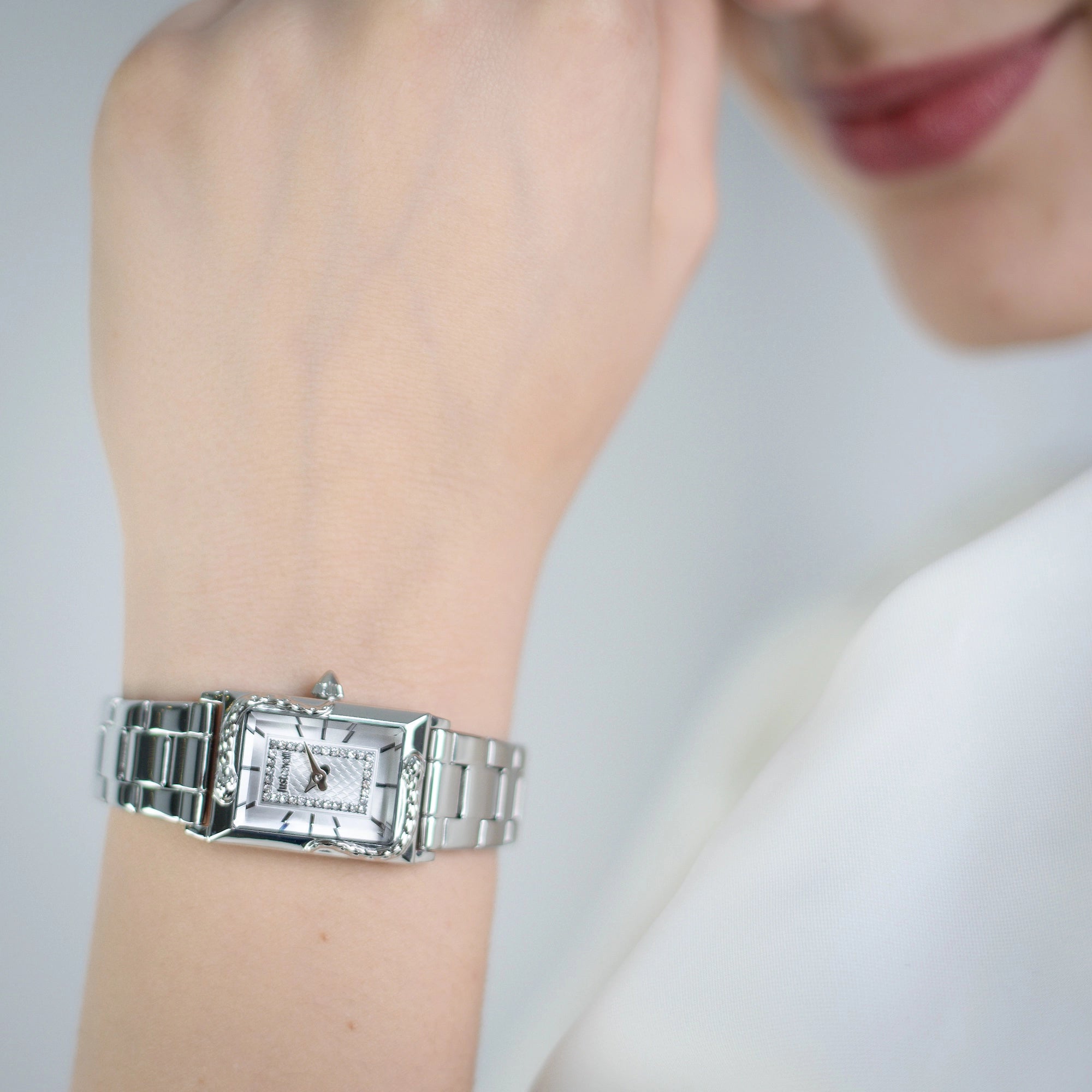 Ignite the sleek allure of a refined silver grey dial in platinum-finish stainless steel, complemented by shimmeringly subtle zircons that dance with every movement. Smooth and cool to the touch, it exudes quiet confidence and modern elegance. The clean lines and luminous reflections enhance its sophisticated charm, perfect for elevating your urban lifestyle. A timeless companion for both daybreak meetings and evening adventures, it promises to define your signature style with grace.