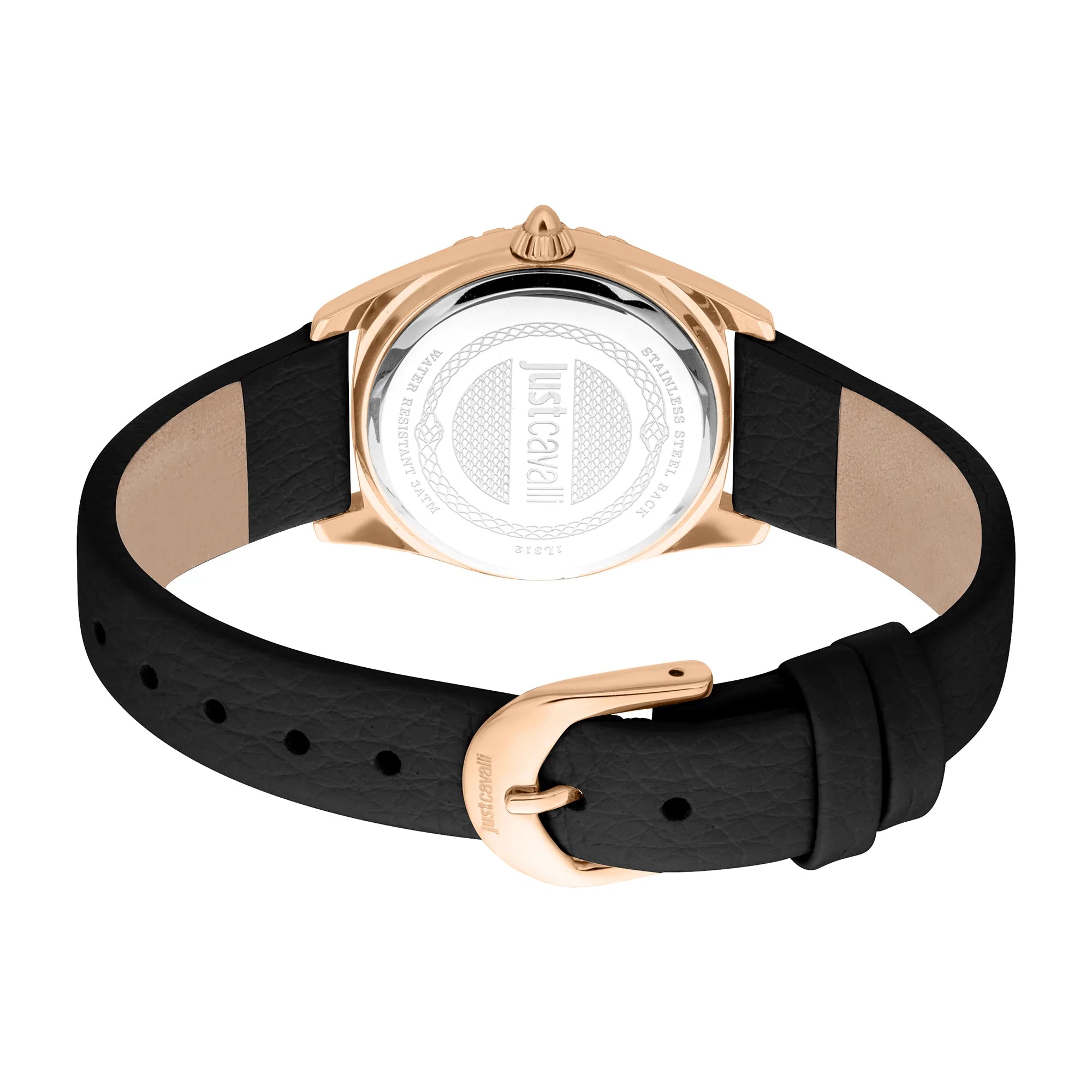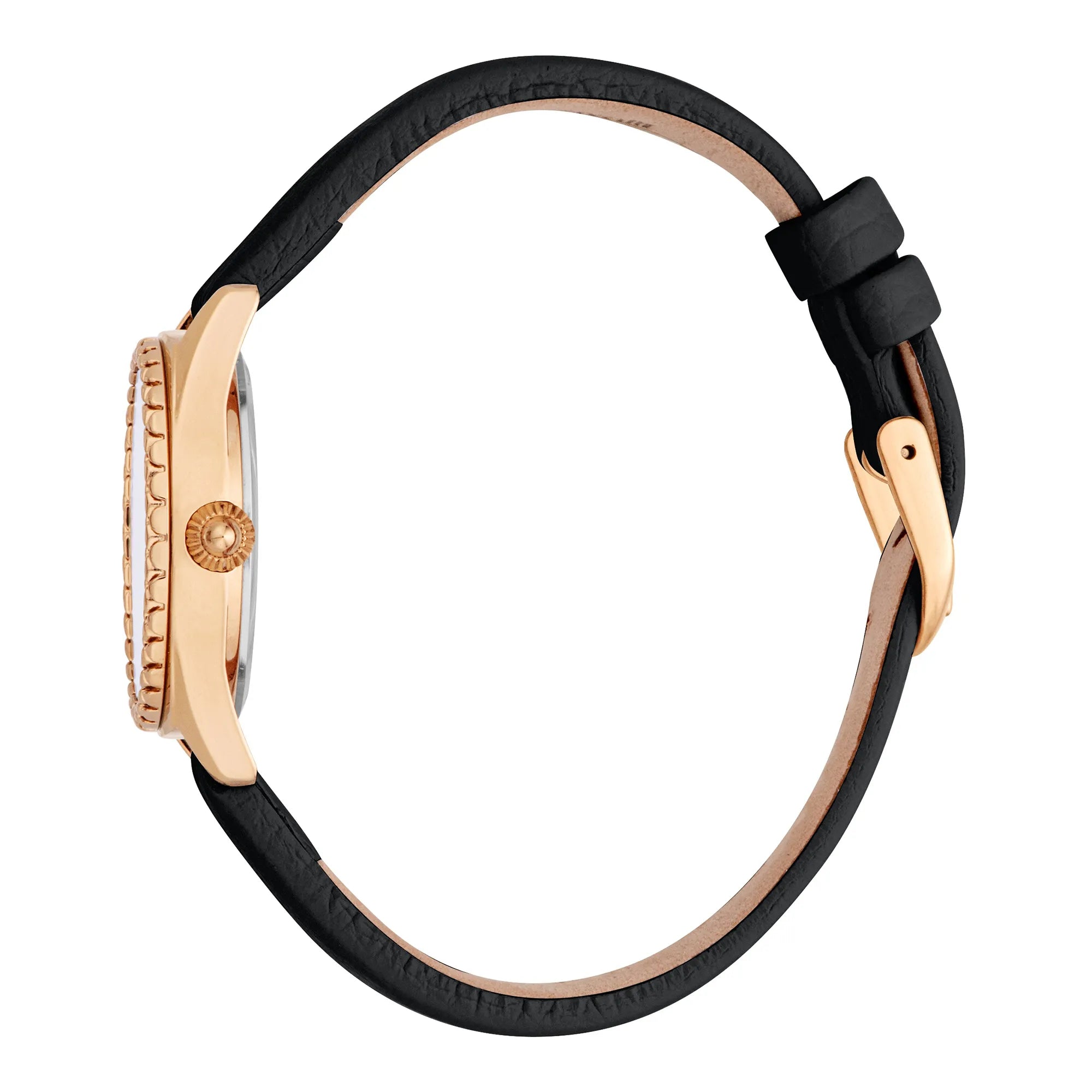 Evoke a sleek allure with a refined, metallic glow in rose gold, complemented by a smooth black leather strap that whispers luxury. Crafted with delicate zircon stones that catch the light with effortless grace, offering a tactile sensation reminiscent of silk. Designed for contemporary women who embrace urban sophistication, it promises to elevate your style with versatile elegance for any occasion.