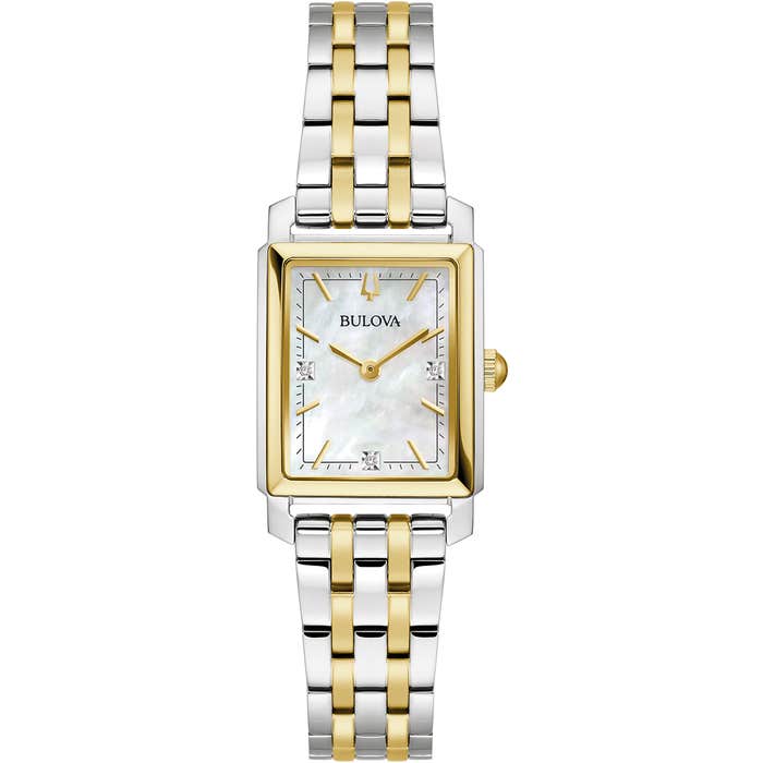 This Bulova ladies’ timepiece brings new style to the already sophisticated Sutton Collection. An elegant two-tone stainless rectangular steel case is paired with a matching bracelet. The lustrous mother-of-pearl dial is accented with gold-tone hour markers and matching hands, including three diamond markers, for a look of true sophistication. This Bulova ladies’ timepiece is perfectly styled for the woman who is ready to make a statement.
