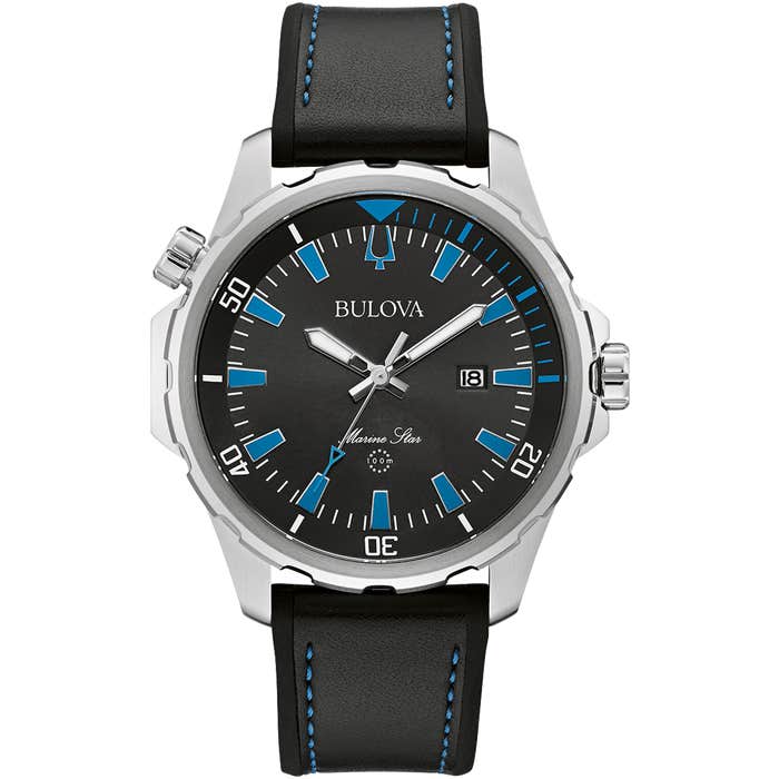 From the Marine Star Collection. This men’s timepiece features a stainless steel case with rotating dial ring to measure elapsed time and a black dial with blue accents and luminous hands and markers. Black silicone strap with blue stitch detail. Flat mineral glass, screw-back case, three-piece buckle closure and water resistance to 100 metres.