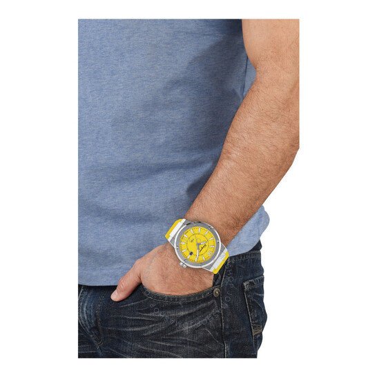 The F-80 offers even more performance and appeal. Sporty and sophisticated, it has an XL-sized case and distinctive decorative features that define the entire collection: six screws on the beze, silicone strapl and guilloche pattern on the dial. Silver-tone stainless steel case with a yellow silicone strap.