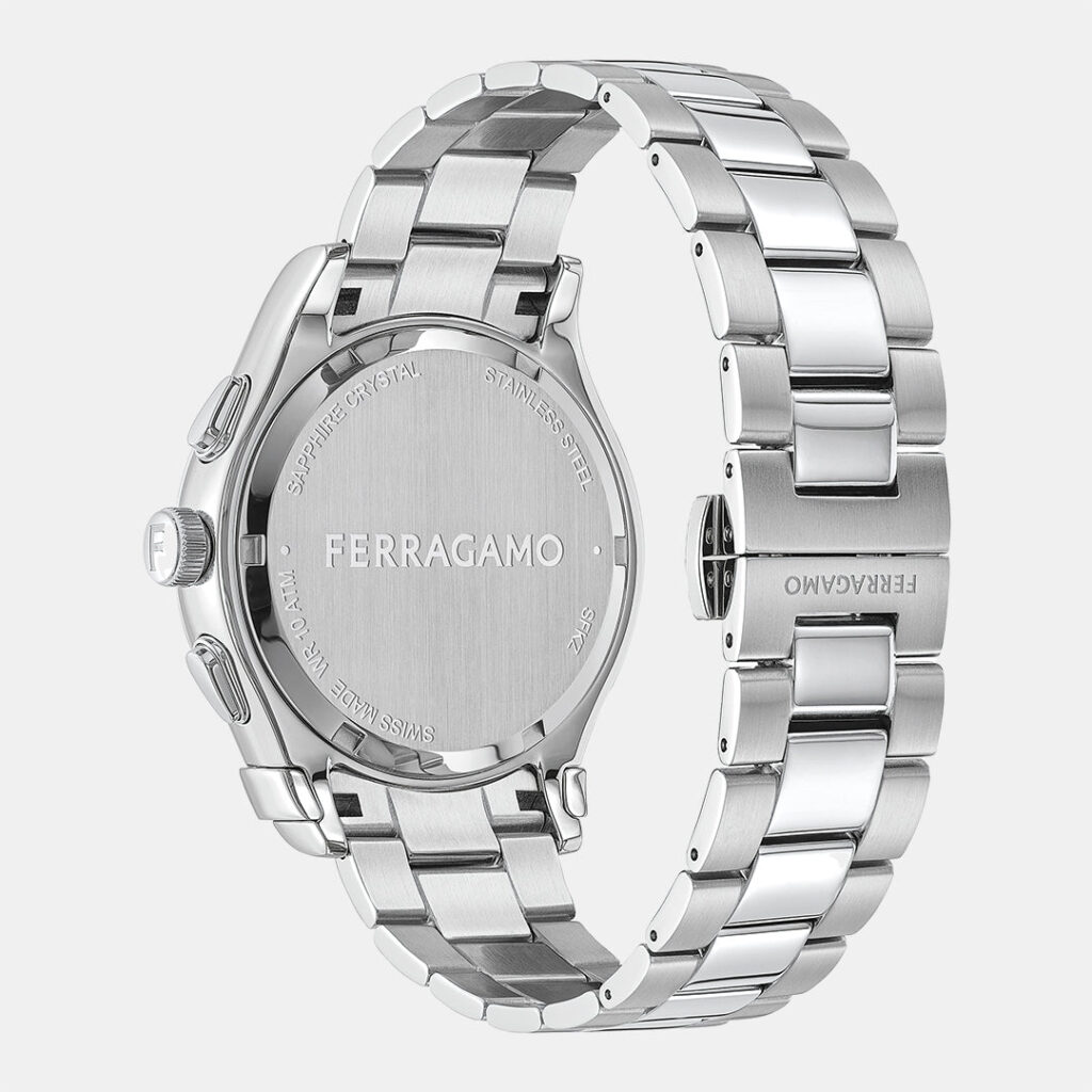 Due to its great success, the iconic Ferragamo Sapphire watch collection is re-imagined with a complex chronograph movement. Sapphire crystal covers the dial and the top ring creating a beautiful, unique layer. For this new collection, the Double Gancini logo is featured on the dial along with the chronograph counter, giving a sporty yet luxurious feel to this successful watch collection.