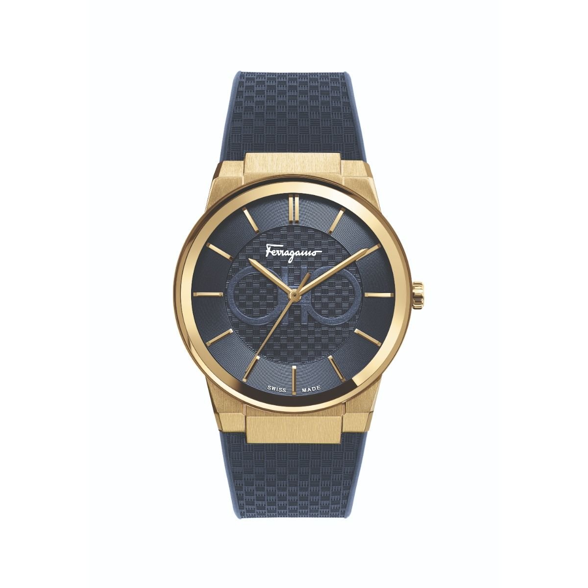 Gold-plated stainless steel case with a blue rubber strap. Fixed gold-plated bezel. Blue (Double Gancini logo) dial with gold-tone hands and index hour markers. Dial Type: Analog. Quartz movement. Scratch resistant sapphire crystal. Pull / push crown. Solid case back. Round case shape. Case size: 41 mm, case thickness: 8.1 mm. Deployment clasp with a push button release. Water resistant at 50 meters / 165 feet. Functions: hour, minute, second. Dress watch style. Watch label: Swiss Made. Salvatore Ferragamo Quartz Blue Dial Blue Rubber Mens Watch SFHP00220.
