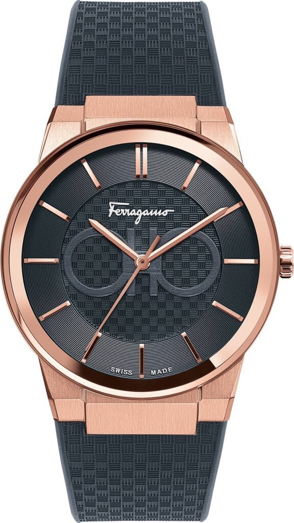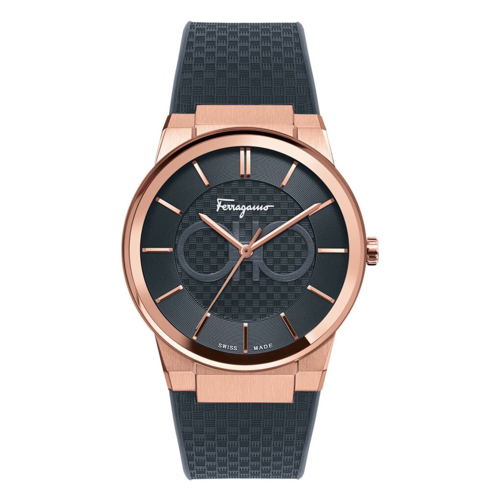 Black (Double Gancini Logo) dial enhanced by rose gold-tone hands. Rose Gold-plated stainless steel case with a black rubber band. Quartz movement. 50 meters / 165 feet water resistance. Fixed bezel. Scratch Resistant Sapphire crystal. Solid caseback. Deployant clasp. Pull / Push crown. Case size 41 mm x 8.1 mm. Band 26 mm x long. Salvatore Ferragamo SFHP00420 Watch.