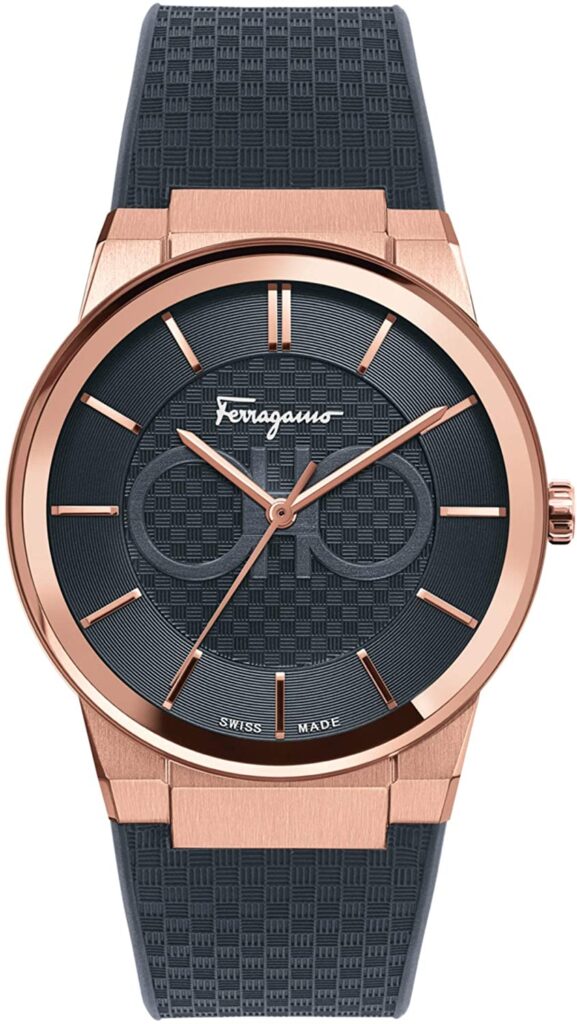 A textured logo dial echos the embossed strap of Ferragamo’s contemporary Sapphire collection timepiece in black with rose gold-tone accents.Â