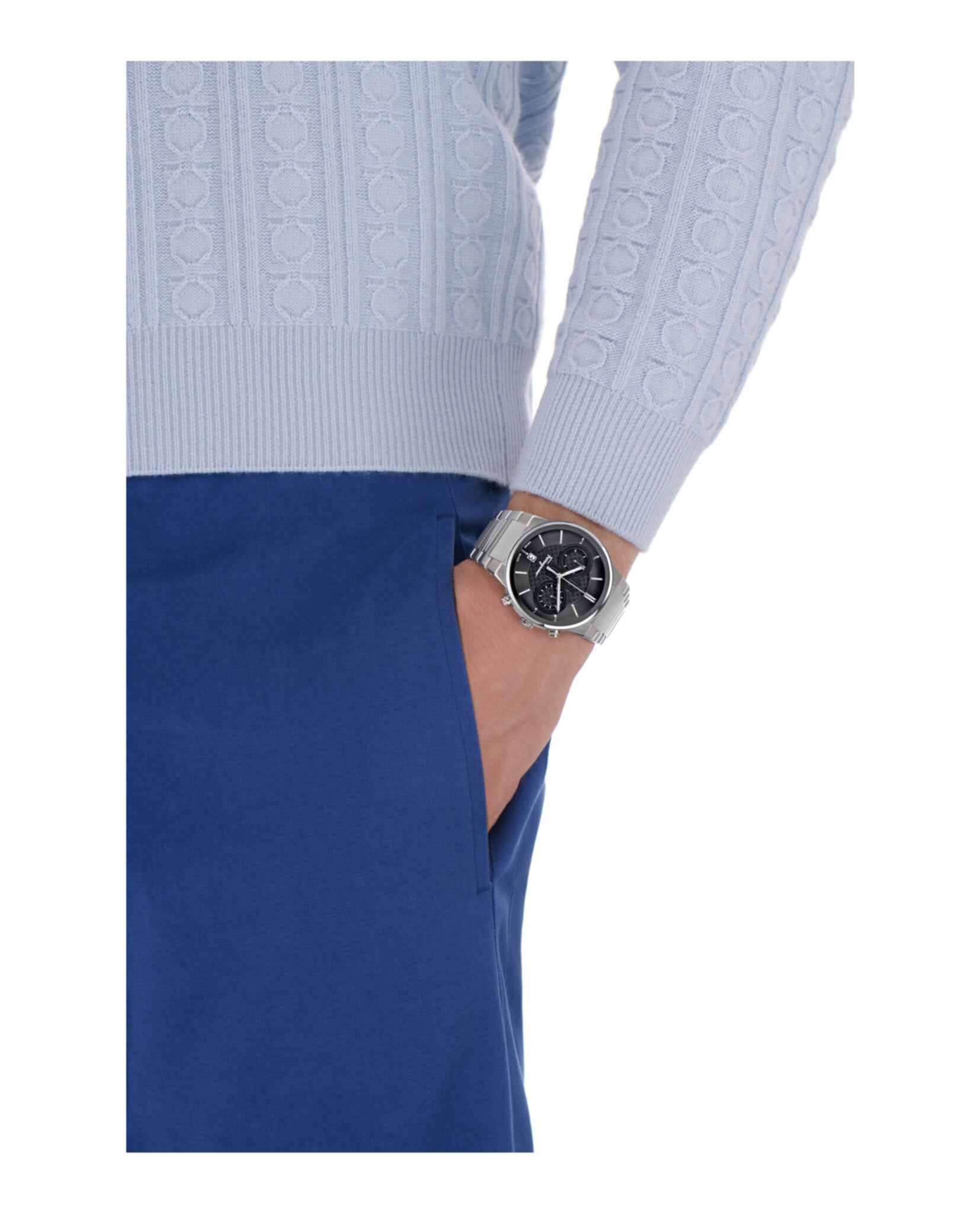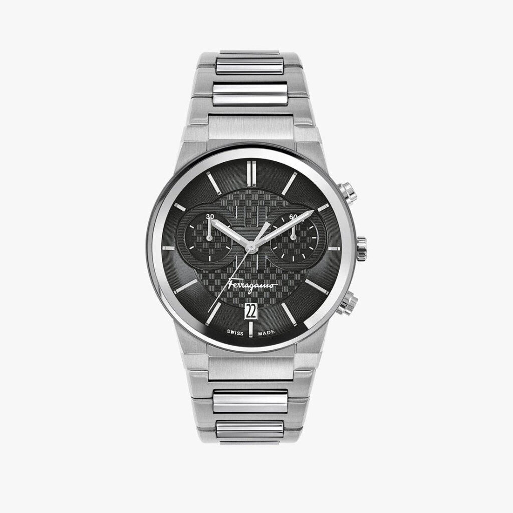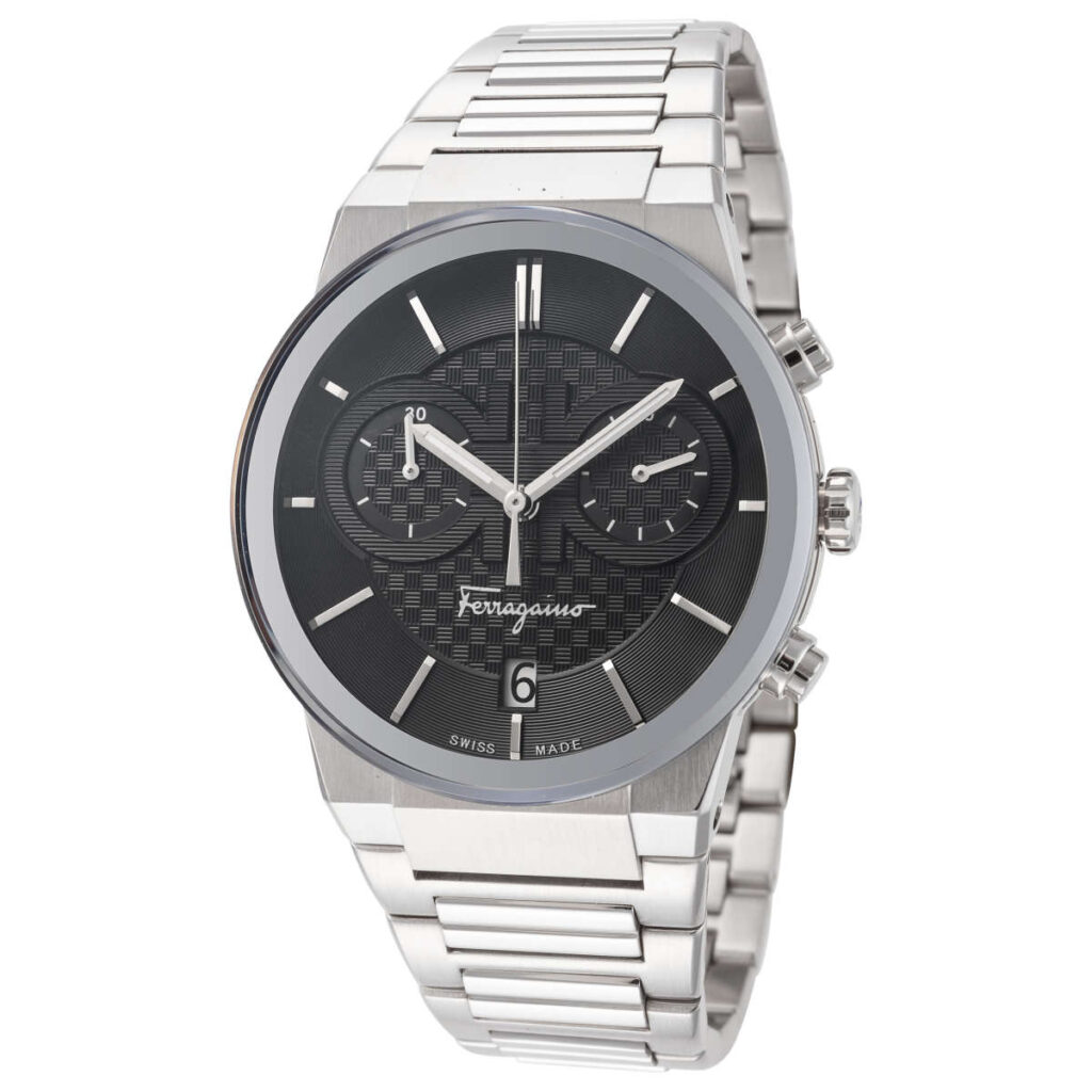 Salvatore Ferragamo Sapphire Chrono SFME00321 men’s chronograph casual wristwatch with quartz movement, 41 mm diameter stainless steel case, black dial, sapphire crystal and stainless steel bracelet
