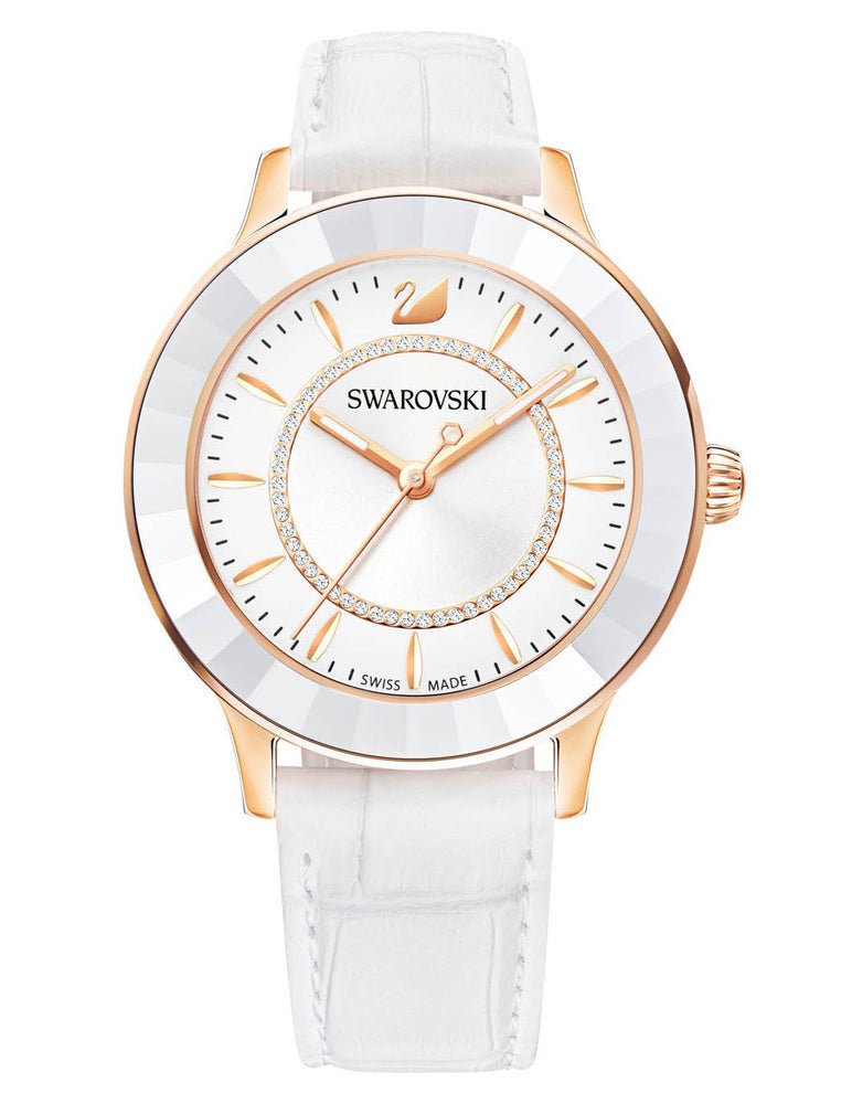 White Dial – Polished Gold PVD Plated Stainless Steel Hour and Minute Hands – Swarovski Logo at 12 O’Clock.