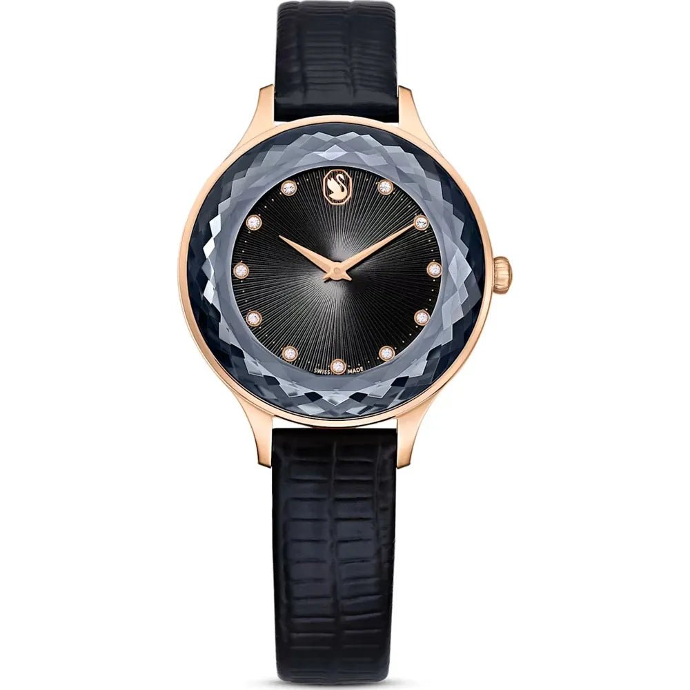 Black Dial – Rose Gold Plated Stainless Steel Hour and Minute Hands – Swarovski Logo at 12 O’Clock – Crystal Hour Markers