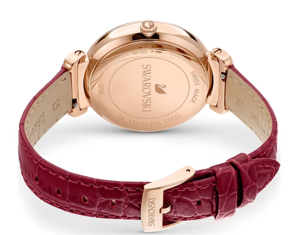 Burgundy Mother of Pearl Dial Embellished with Crystals – Crystal Bezel – Polished Rose Gold PVD Plated Stainless Steel Hour and Minute Hands – Moon Phase Aperture - Swarovski Logo at 12 O’Clock.