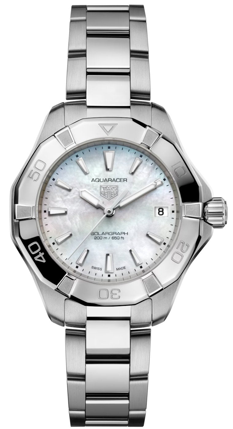 TAG Heuer Aquaracer Professional 200 Solargraph 34 WBP1312.BA0005. Immerse yourself in the celestial allure of the northern lights with this TAG Heuer Aquaracer, equipped with our Solargraph movement. Designed as an elegant yet resilient timepiece for the modern explorer, this sumptuous 34 mm watch is your go-to companion for rugged adventures and urban sophistication.