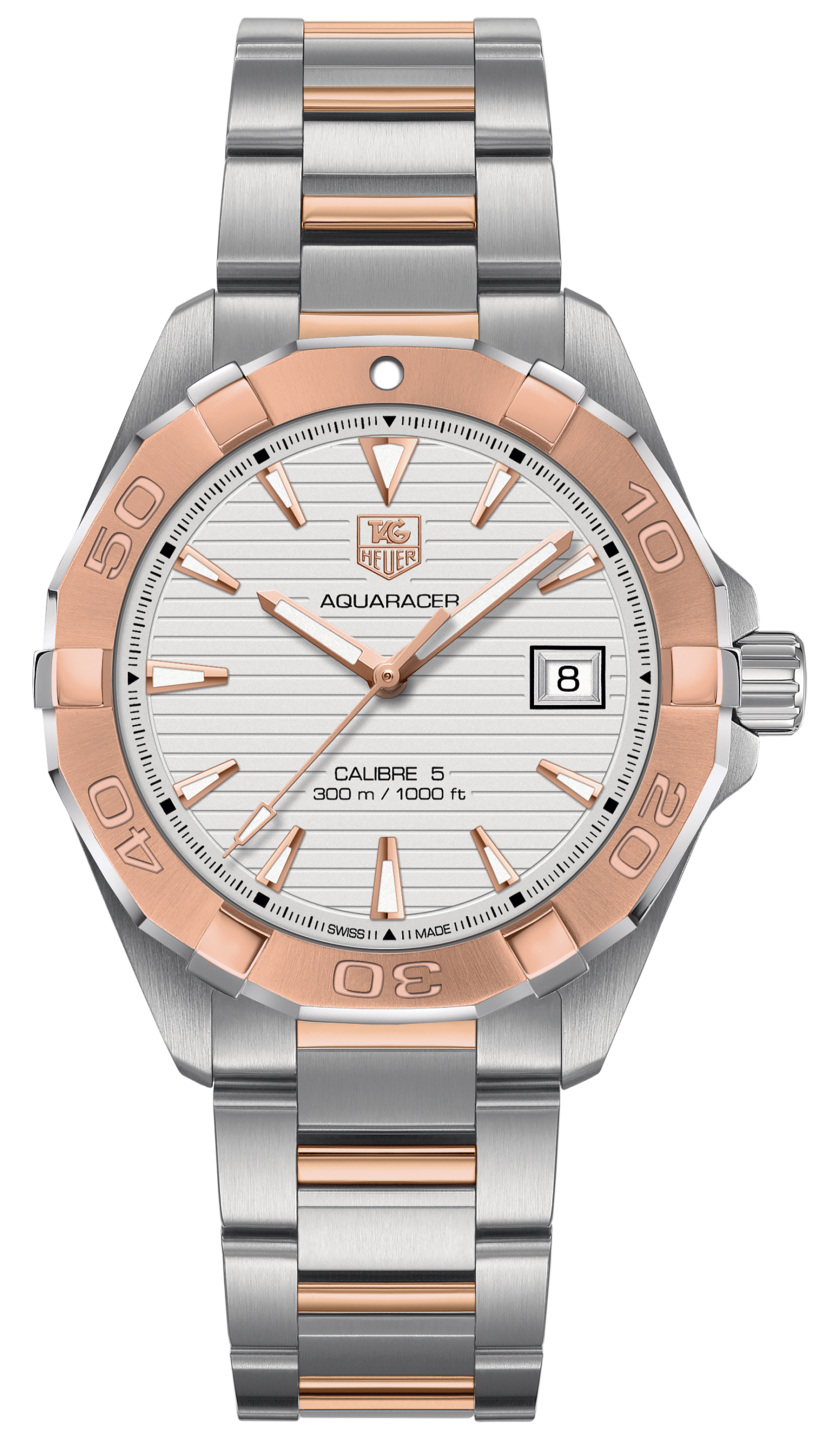 Swiss-made, this bold TAG Heuer Aquaracer is an aesthetic 41 mm watch. This model features a Steel and Gold case and a Calibre 5 Automatic movement.