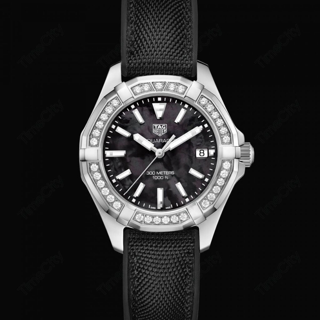 Luxury watches TAG Heuer Aquaracer Diamonds, Quartz, 35 mm. The watch has functions luminescence and date . Basic parameters of the watch are: dial colour is pearl and black, movement type is Quartz watches, water resistent is 300 m and strap material is rubber and textiles.