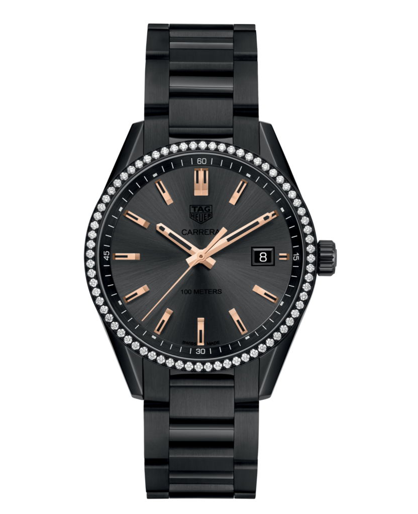Black titanium case with a black titanium bracelet. Fixed- set with 72 wesselton diamonds black aluminum bezel. Anthracite dial with rose gold-tone hands and index hour markers. Minute markers around the outer rim. Dial Type: Analog. Date display at the 3 o’clock position. Quartz movement. Scratch resistant sapphire crystal. Case size: 39 mm. Round case shape. Water resistant at 100 meters / 330 feet. Functions: date, hour, minute, second. Watch label: Swiss Made. Tag Heuer Carrera Anthracite Dial Ladies Titanium Diamond Watch WAR1115.BA0602.