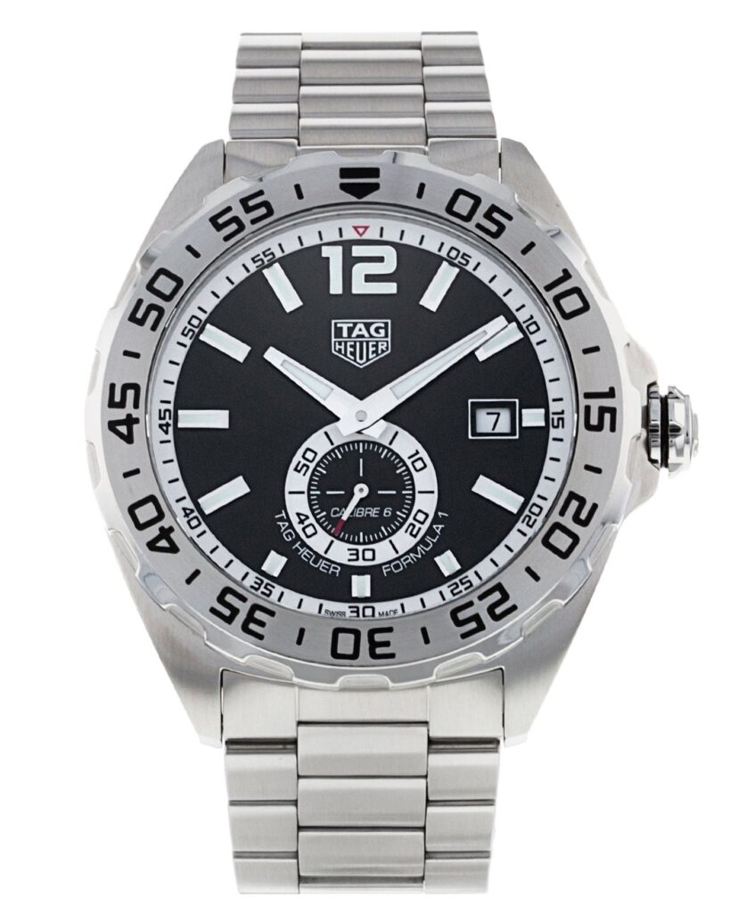 Brand New Authentic Tag Heuer Formula 1 Automatic Calibre 6 Black Dial 43mm Steel Men’s Watch Model WAZ2012.BA0842. Stainless Steel case with Silver Stainless Steel watch band. New Style Tag Heuer Deployment Deployment with Push Button and Foldover clasp. Uni-Directional Rotating bezel. Dial description: Black with silver luminous hands and Index hour marker dial.