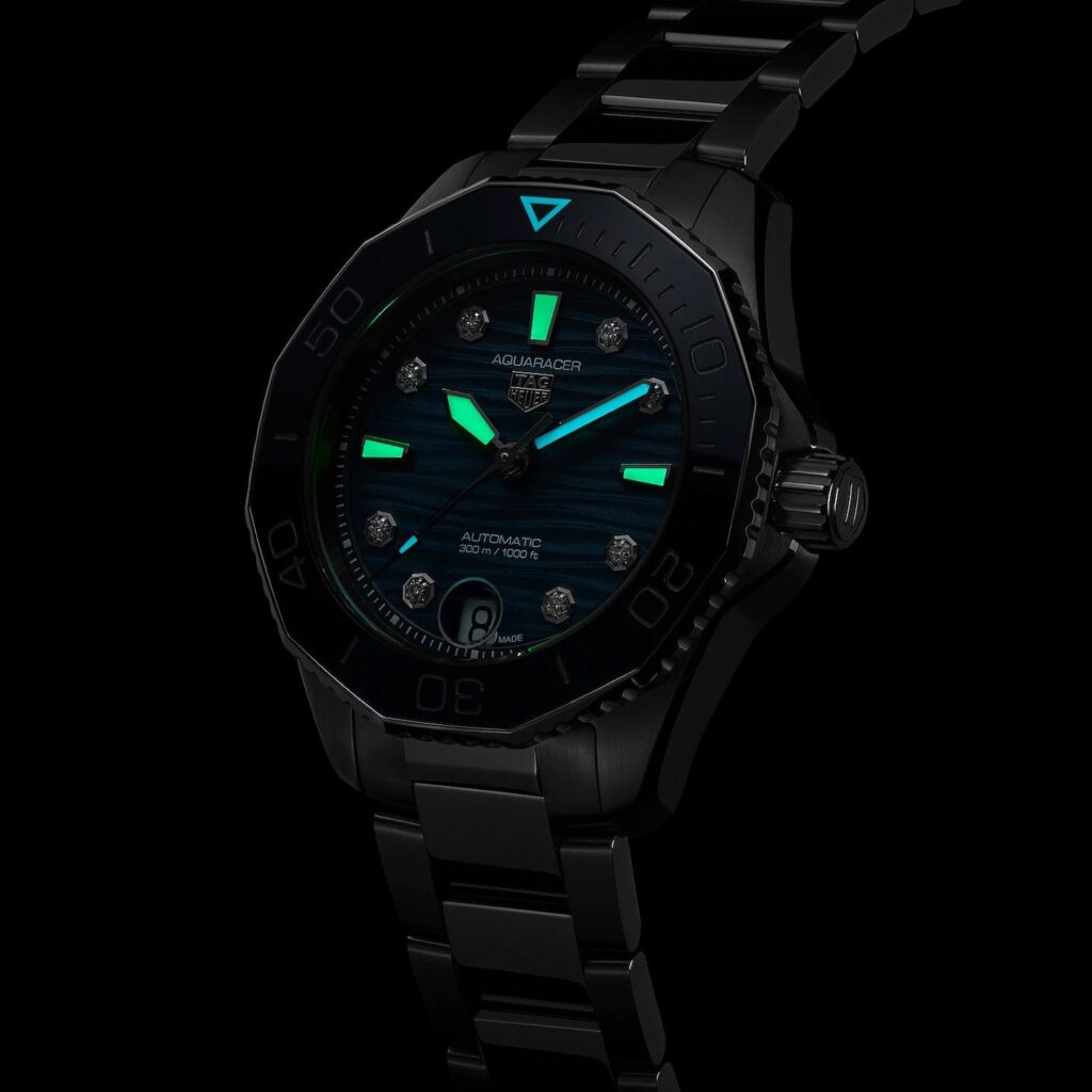 The TAG Heuer Aquaracer WBP231B.BA0618 Ladies’ Diamond Blue Dial Diver Watch offers a perfect combination of luxurious elegance and high-performance functionality. The watch features a mesmerizing blue dial, accented with 11 sparkling diamond hour markers, evoking a sense of the ocean’s allure. The horizontal streak detailing adds depth and texture, while the luminous hands provide optimal readability, even in low-light conditions.