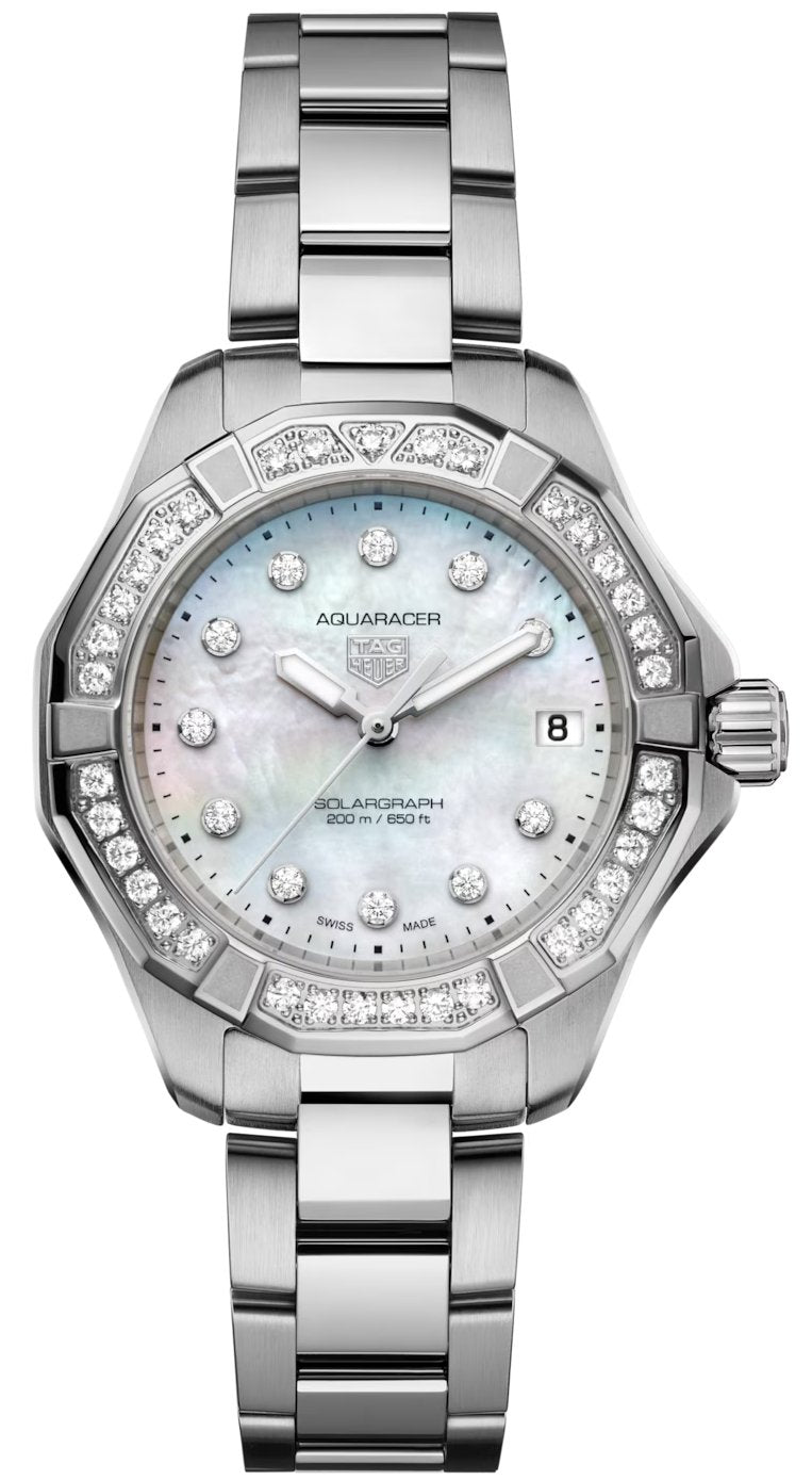 TAG Heuer Watch Aquaracer Professional 200 Solargraph 34 WBP1314.BA0005. Thirty-five glistening diamonds (0.6cts) set on the bezel and eleven diamonds (0.15cts) on the radiant mother-of-pearl dial elevate this 34mm TAG Heuer Aquaracer. Meticulously crafted in steel, it combines enduring resilience with unparalleled sophistication, ready to face any challenge with sheer elegance.
