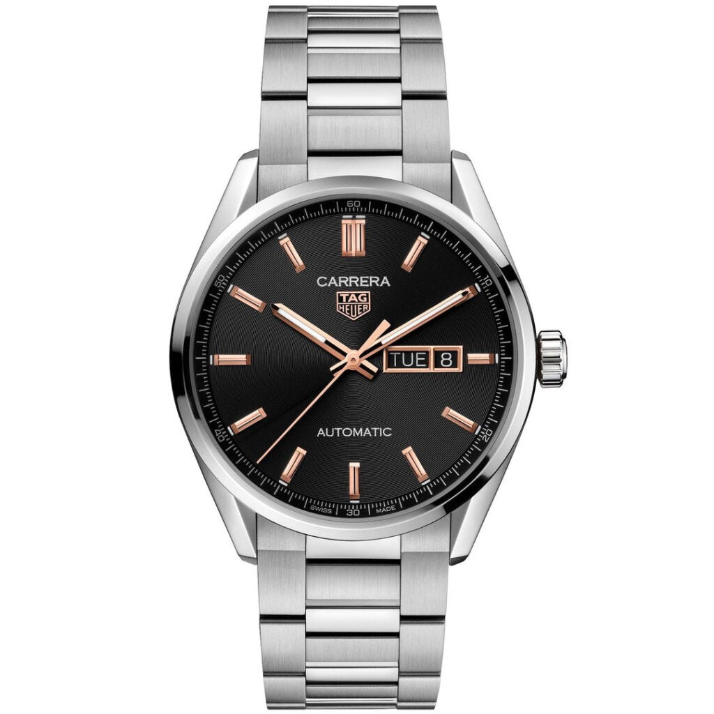Renowned for their highly accurate and powerful movements, TAG Heuer have equipped this TAG Heuer Carrera watch with one of their famous Swiss made self-winding calibres. The Calibre 5 automatic movement brings to life the hour, minute and seconds function and a double day and date window 3 o’clock on a mesmerising black concentric-pattered dial. The functions are displayed using sleek rose gold plated hands with white Superluminova inserts and matching rose gold applied indexes. Protecting the dial is a layer of sapphire crystal glass famed for its scratch resistance and crisp legibility equipped to a 41mm stainless steel case with an exhibition case back. For one final touch of sophistication, this TAG Heuer Carrera watch for men is fitted with a H-shaped stainless steel bracelet and classic folding clasp.