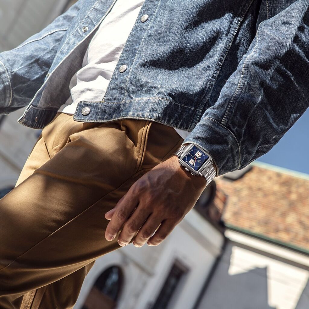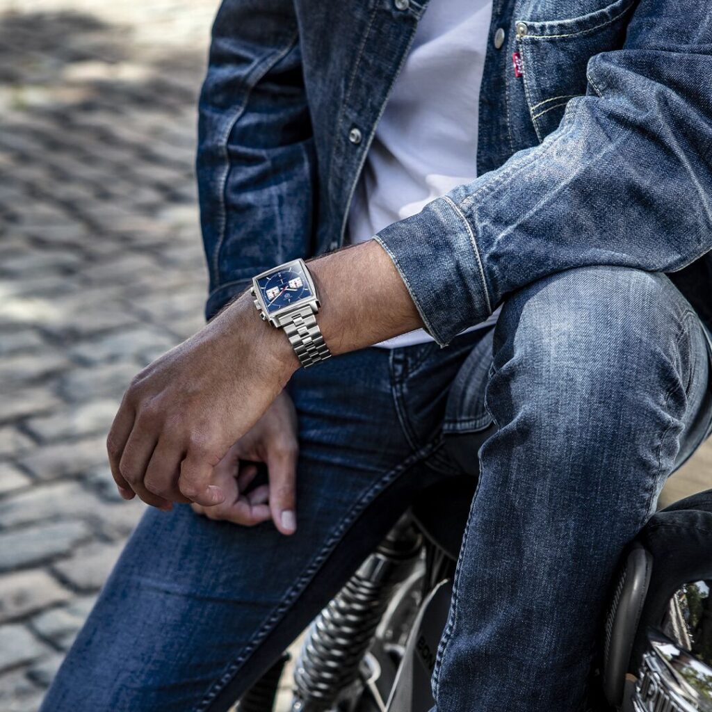 The Heuer 02 movement, which provides an 80 hour power reserve, puts its performance and decoration on show behind a sapphire exhibition caseback. The engine propels a set of Super LumiNova hands and a red coated central chronograph hand around the signature Monaco blue dial. This display is also equipped with sub counters filled with silver, offering 30 minute and 12 hour functions. The small counter at 6 o’clock displays continuous seconds and, as with all elements on the dial, is protected underneath a strong lens crafted from sapphire crystal glass. The watch also features a large date display at 6 o’clock.
