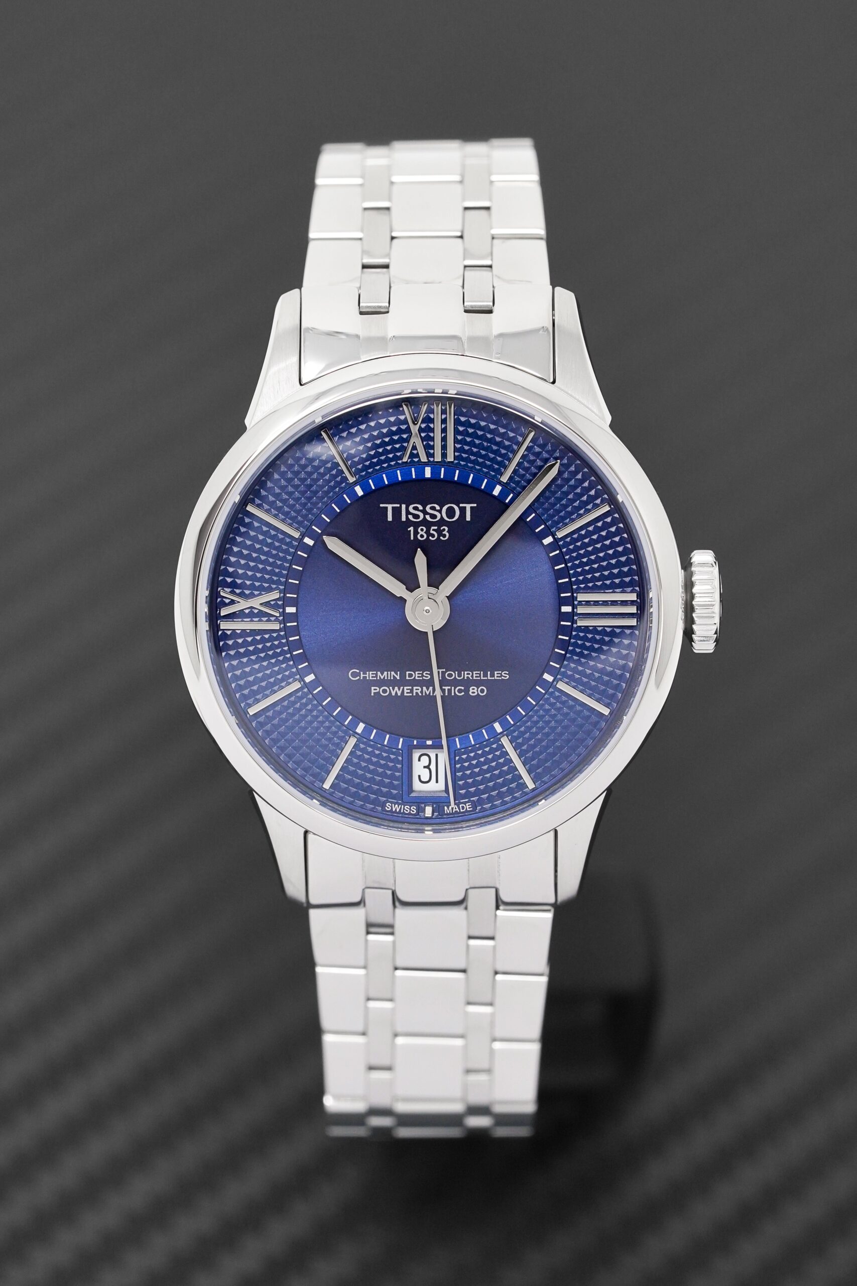 Blue Guillochè Sector Dial. Applied Steel Roman Numeral Indexes. Stainless Steel Hands. Date Window at 6 O’Clock.