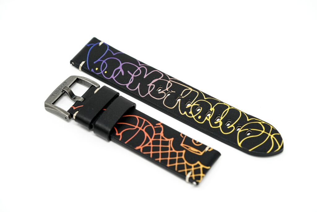 22mm Black Leather Strap with Antique Stainless Steel Pin Buckle. Interchangeable Graphic Black Leather Strap