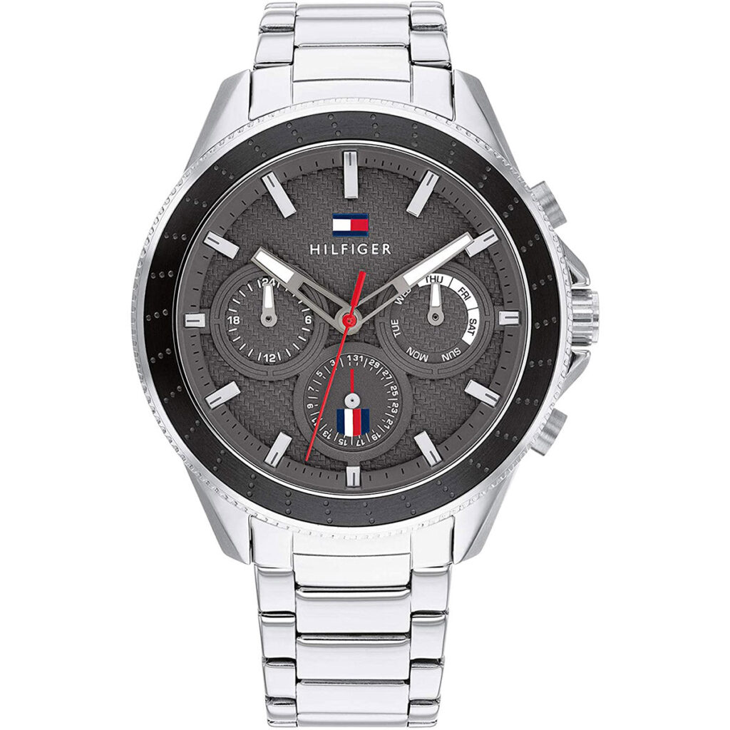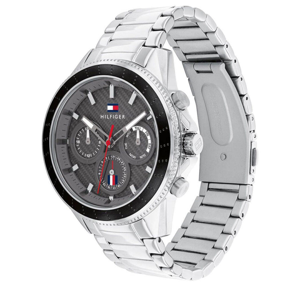 This collection features an elevated sport interpretation with iconic brand elements. With a 44MM case, the faux carbon fiber texture dial features a multifunction movement and classic Tommy details. Fixed on integrated bracelets and silicone straps. 5 ATM/ 50 Meters.