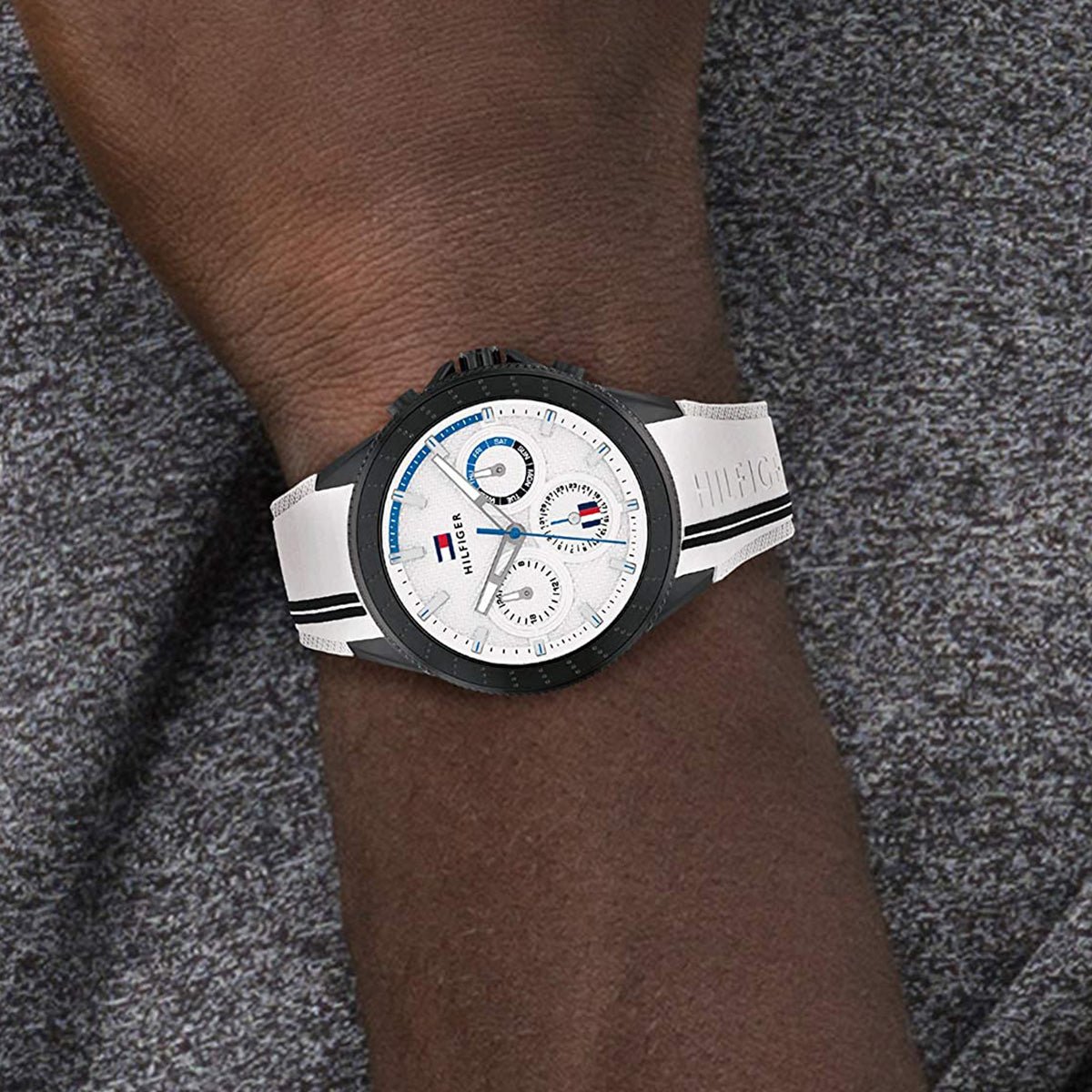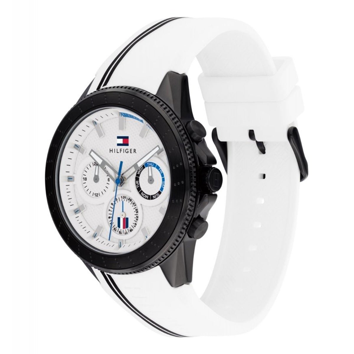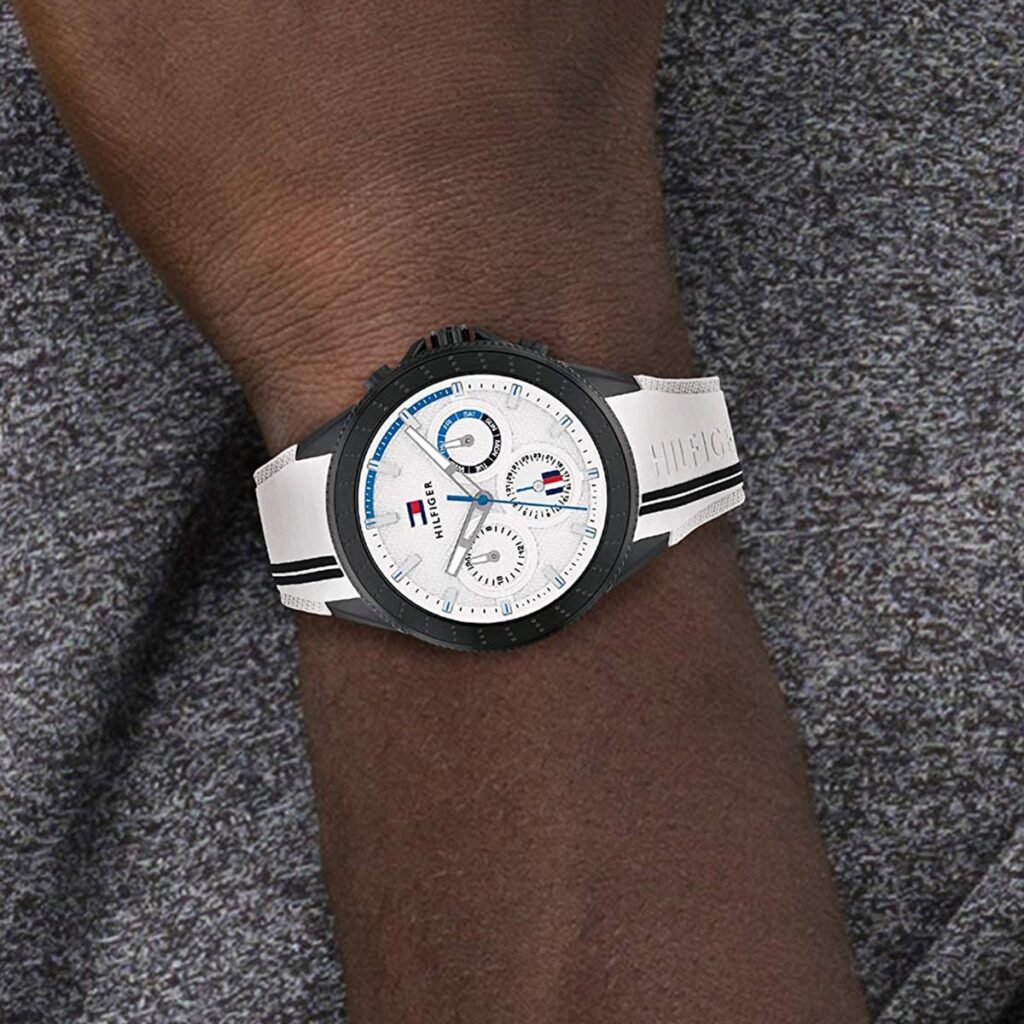 The Men’s Tommy Hilfiger Watch 1791862 (1791862) is available to buy from Shade Station. It features a white silicone strap, an ip black stainless steel case and has a white with three hand movement, sub dial day/date display dial.Â