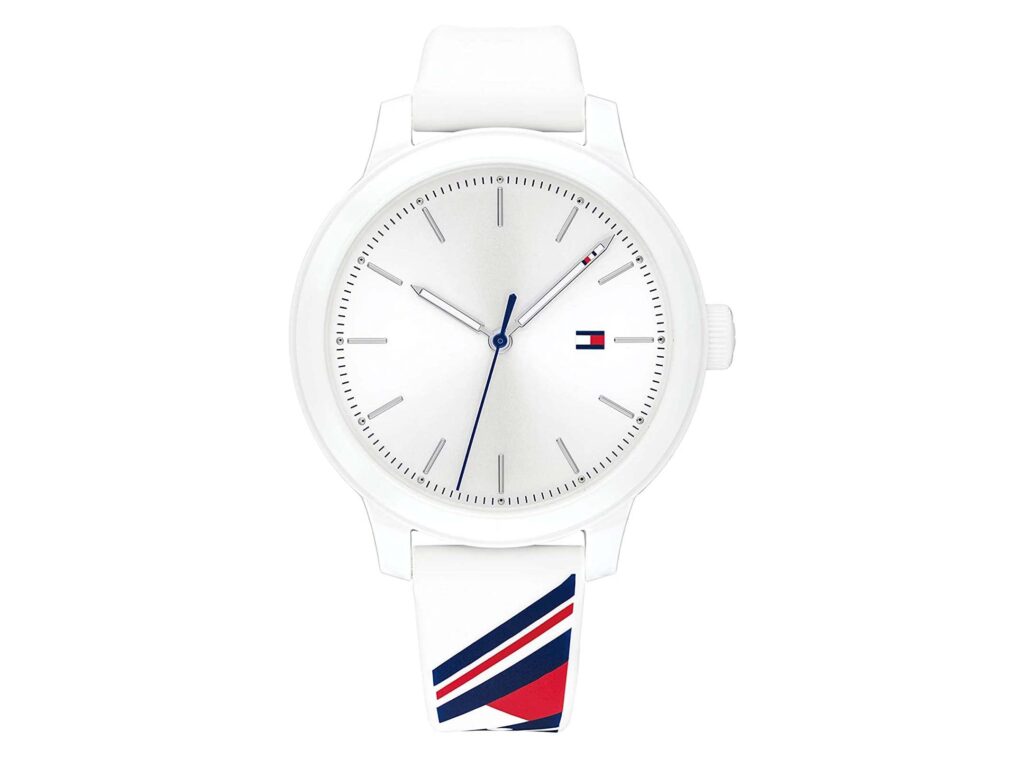 Tommy Hilfiger women’s watch. Time after time, our sport watch delivers. This version offers sweeping 3-hand movement, and a durable silicone strap with a bold rendering of our iconic flag. 38mm white case, silver-white dial, white silicone strap.