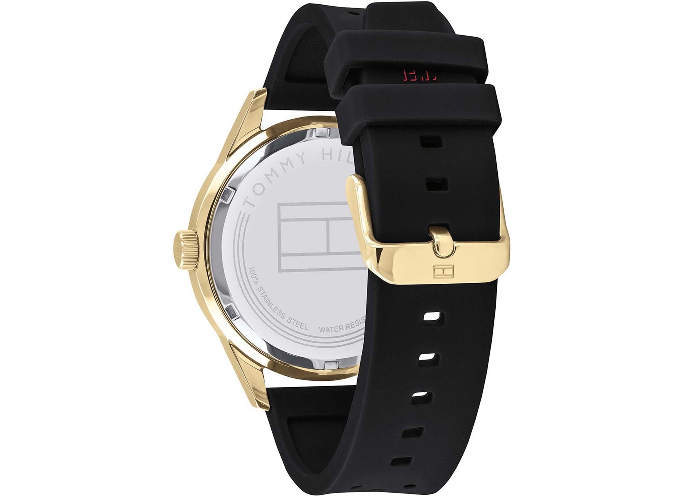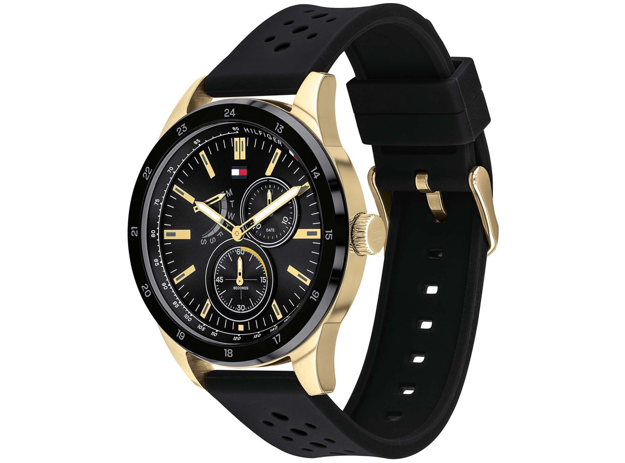 This Men’s Tommy Hilfiger Austin Watch has a gold tone stainless steel case, black dial and a black silicone strap. The day date and seconds are on sub-dials