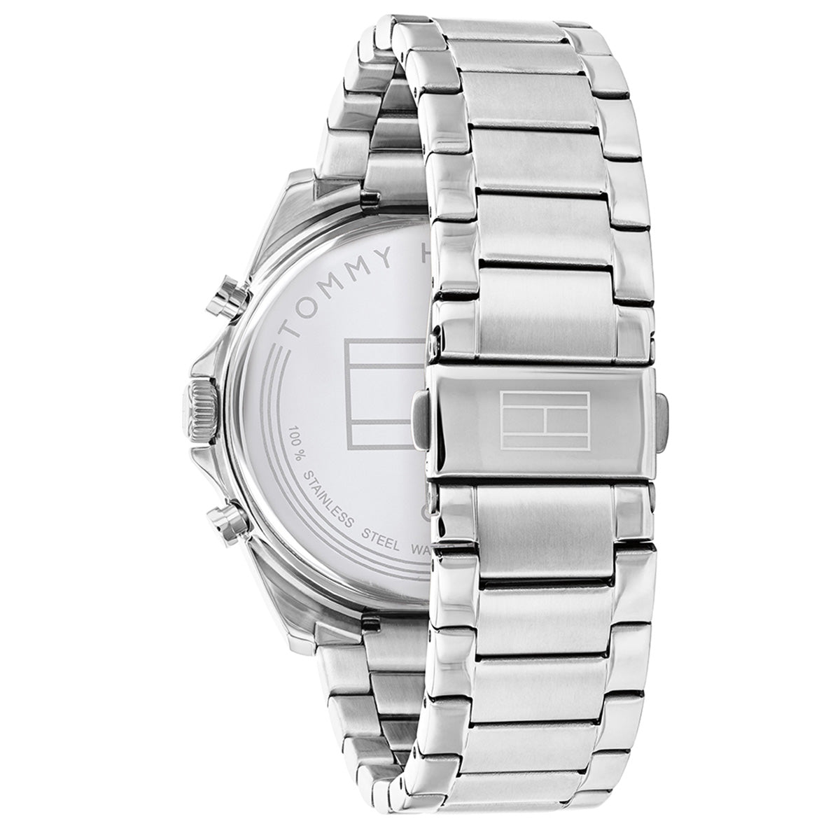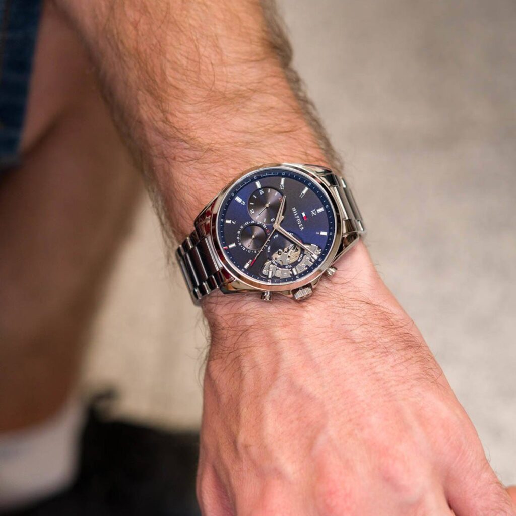This Tommy Hilfiger watch has a stainless steel case 44mm in diameter and is fitted with a metal strap. Inside the case lies a movement and the watch features a mineral crystal.