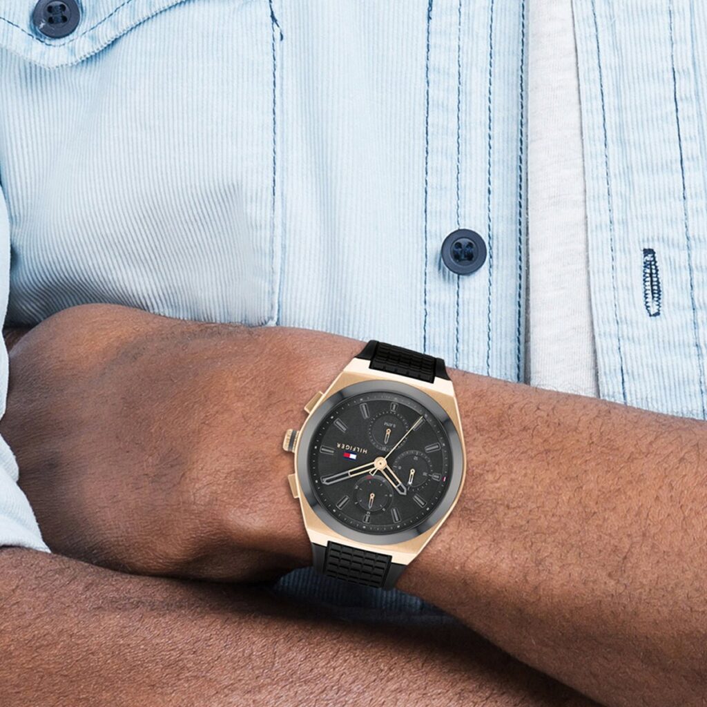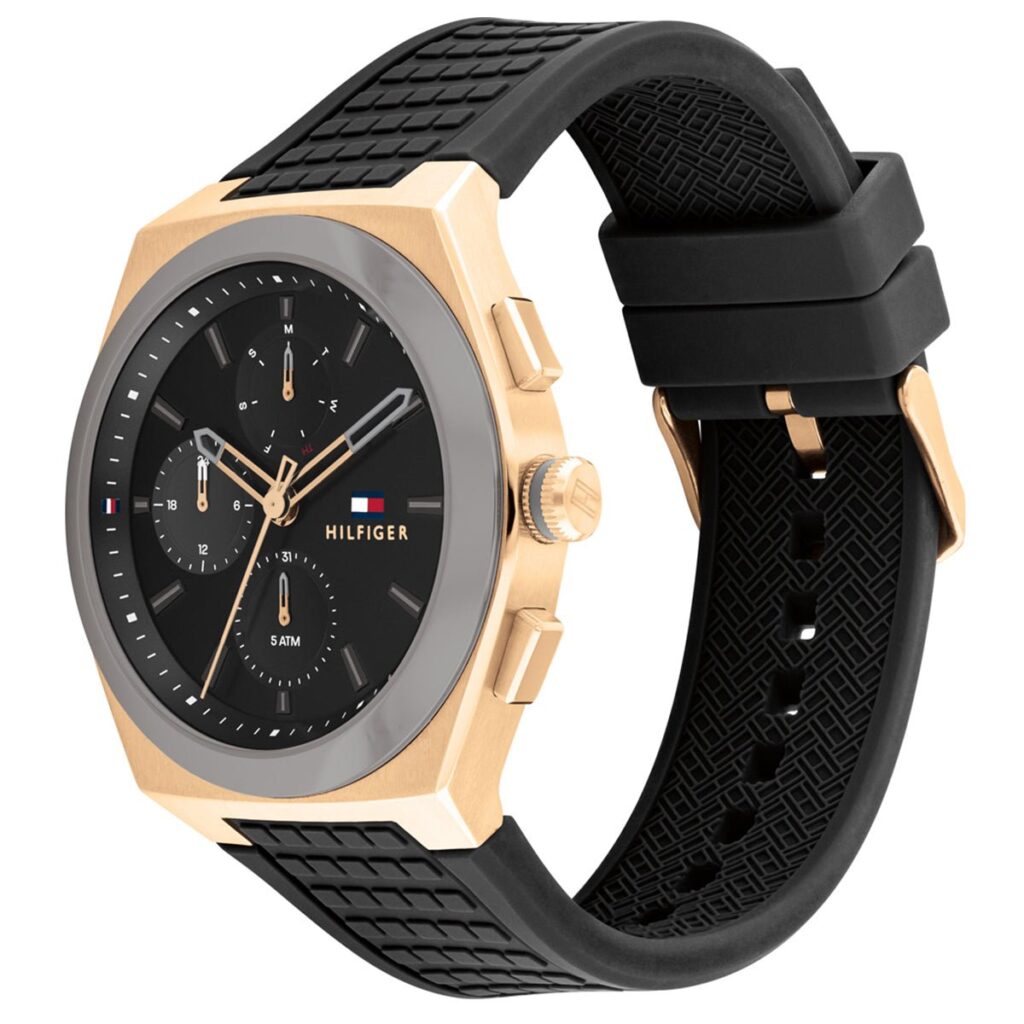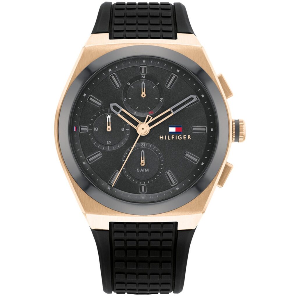 This Tommy Hilfiger watch has a stainless steel case 44mm in diameter and is fitted with a rubber strap. Inside the case lies a movement and the watch features a mineral crystal.