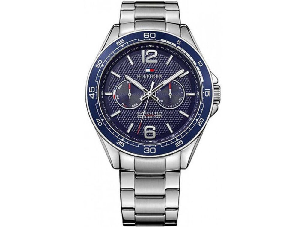 Modern casual meets sophisticated sport in this new multi-eye bracelet watch for men. Crafted of solid stainless steel, it features a 46mm case with sleek black ion-plated aluminum sport bezel, and a blue enamel dial with day and date subdials, Arabic numerals/stick markers and fine line minute reflector. HILFIGER name/flag logo positioned at 12:00. Water resistant to 5 ATM/50 meters.