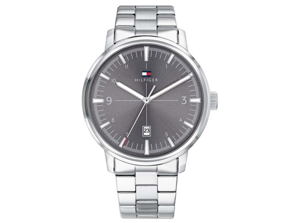 Tommy Hilfiger Grey Dial Stainless Steel Watch For Men. Water Resistent. Push Button Deployment Clasp. Analog Display. Swissam Made