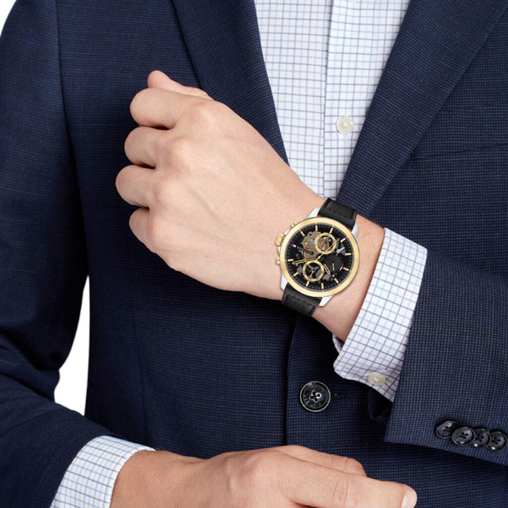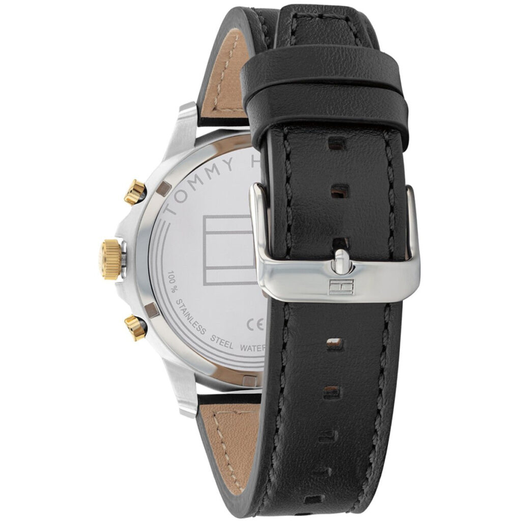 This Tommy Hilfiger watch has a stainless steel case 44mm in diameter and is fitted with a leather strap. Inside the case lies a movement and the watch features a mineral crystal.