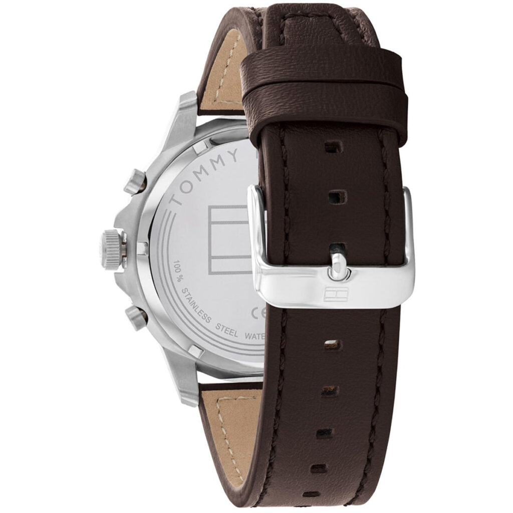This Tommy Hilfiger watch has a stainless steel case 44mm in diameter and is fitted with a leather strap. Inside the case lies a movement and the watch features a mineral crystal.