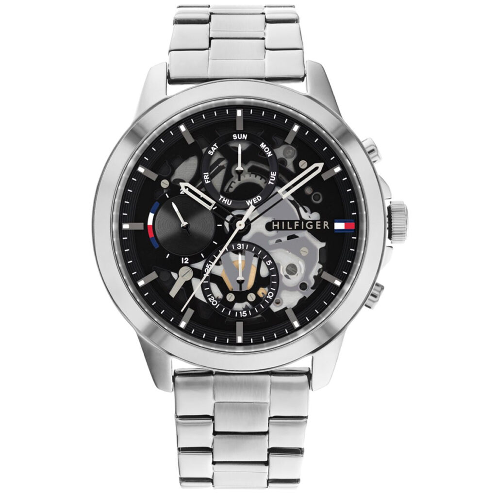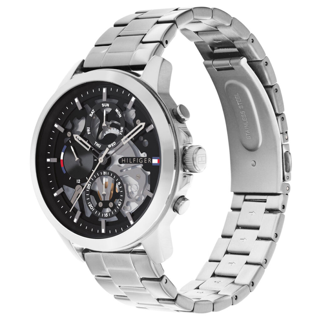 This Tommy Hilfiger watch has a stainless steel case 44mm in diameter and is fitted with a metal strap. Inside the case lies a movement and the watch features a mineral crystal.