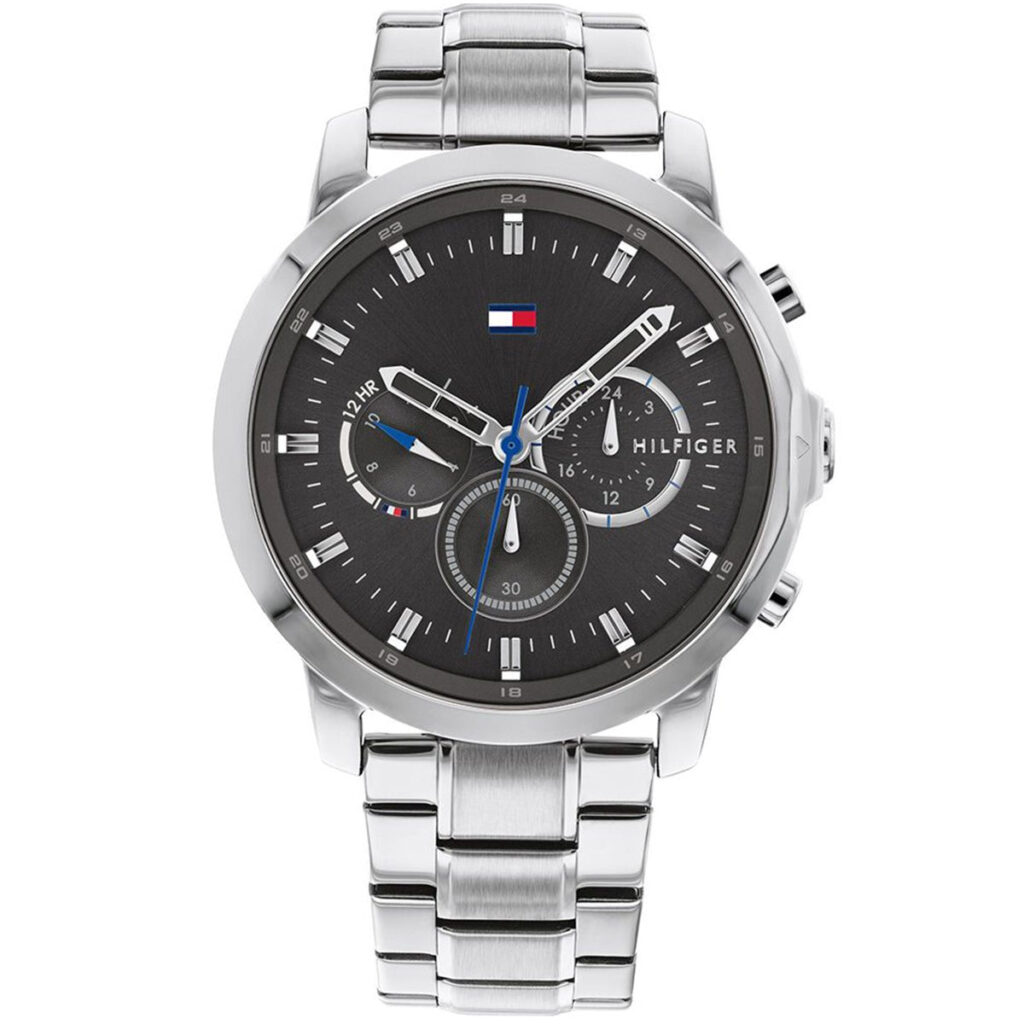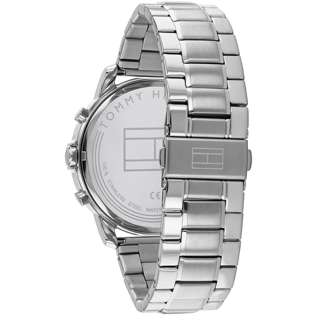 This Tommy Hilfiger watch has a stainless steel case 46mm in diameter and is fitted with a metal strap. Inside the case lies a movement and the watch features a mineral crystal. The watch is 5ATM. This means the watch is suitable for showering.