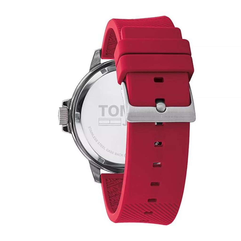 - 44mm stainless steel brass case and red silicone strap, three-hand movement.