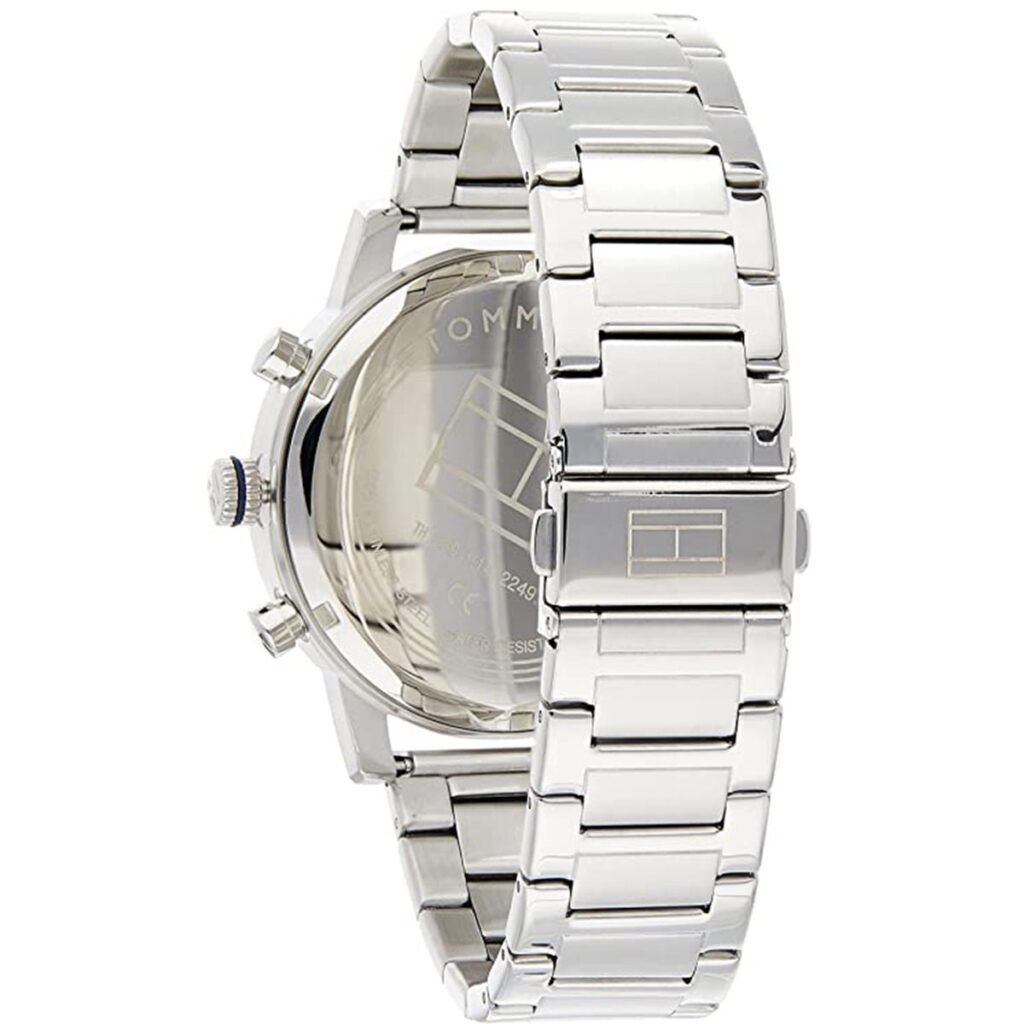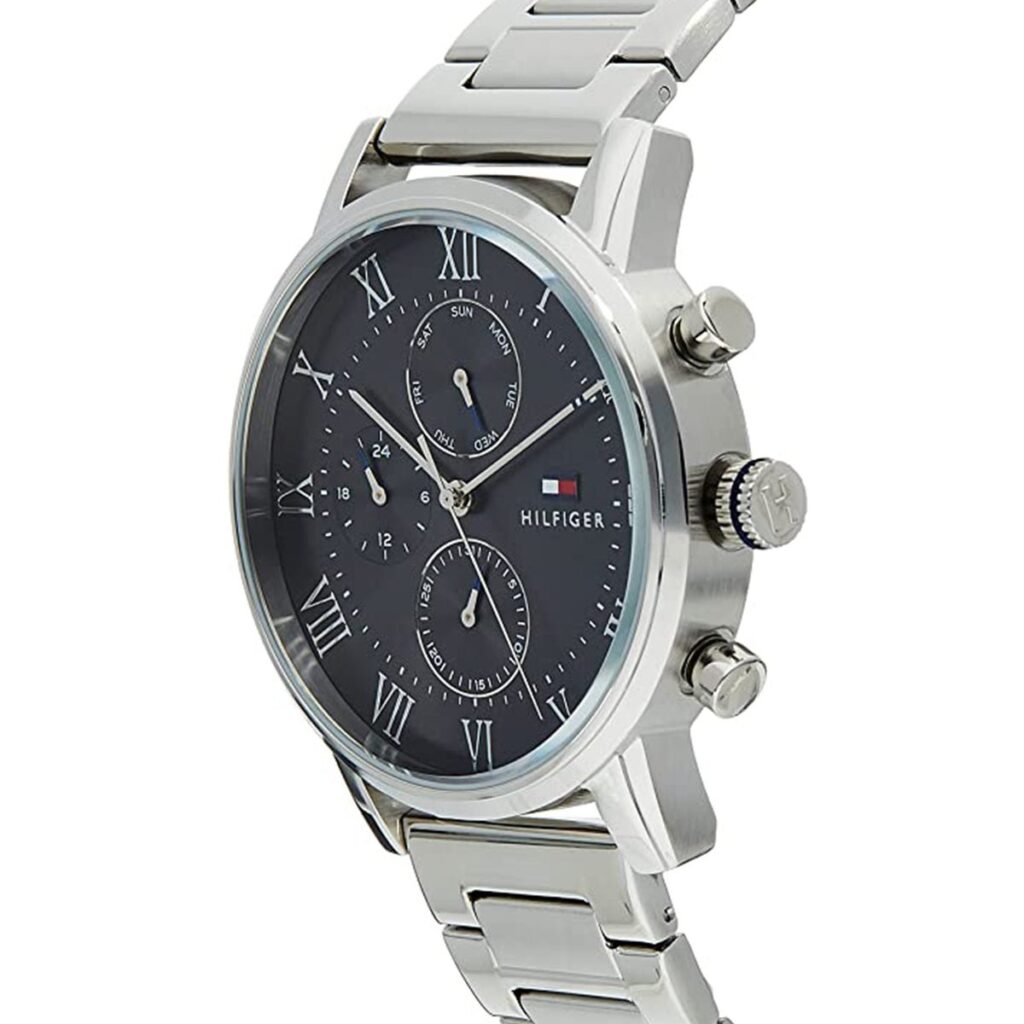 This Tommy Hilfiger Men’s watch is smart and masculine. Along with a silver band, black face this timepiece also features Roman numeral numbering.