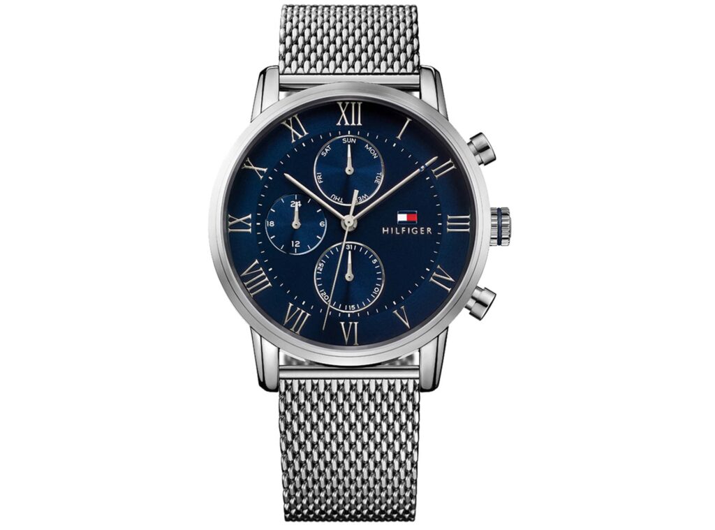 Tommy Hilfiger men’s watch. Our sophisticated take on the sport watch gives you functionality with a polished finish. Don’t worry if you accidently wear this one in the shower, it’s water resistant. This one features a blue dial and the accuracy of multi-eye movement. Stainless steel case and mesh bracelet.