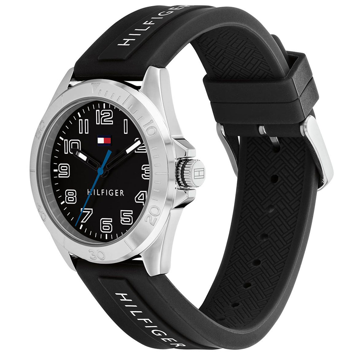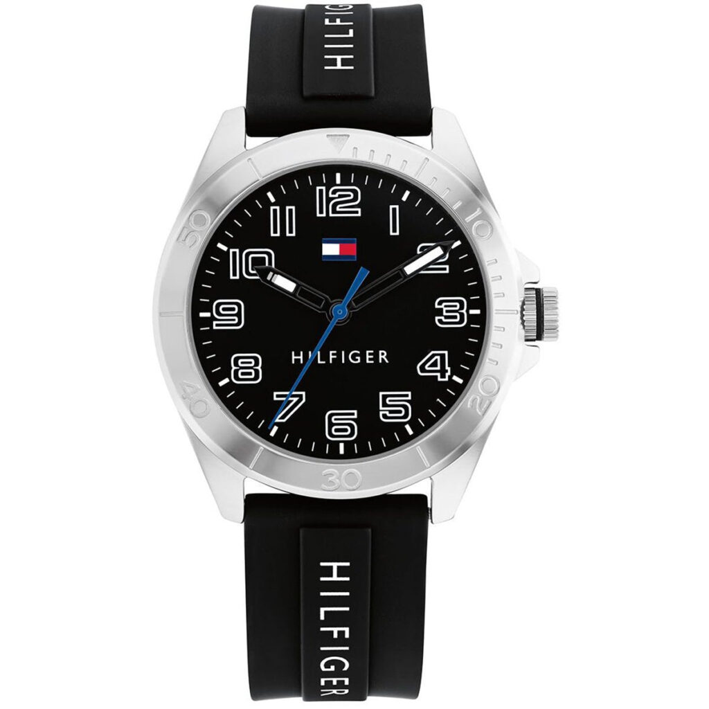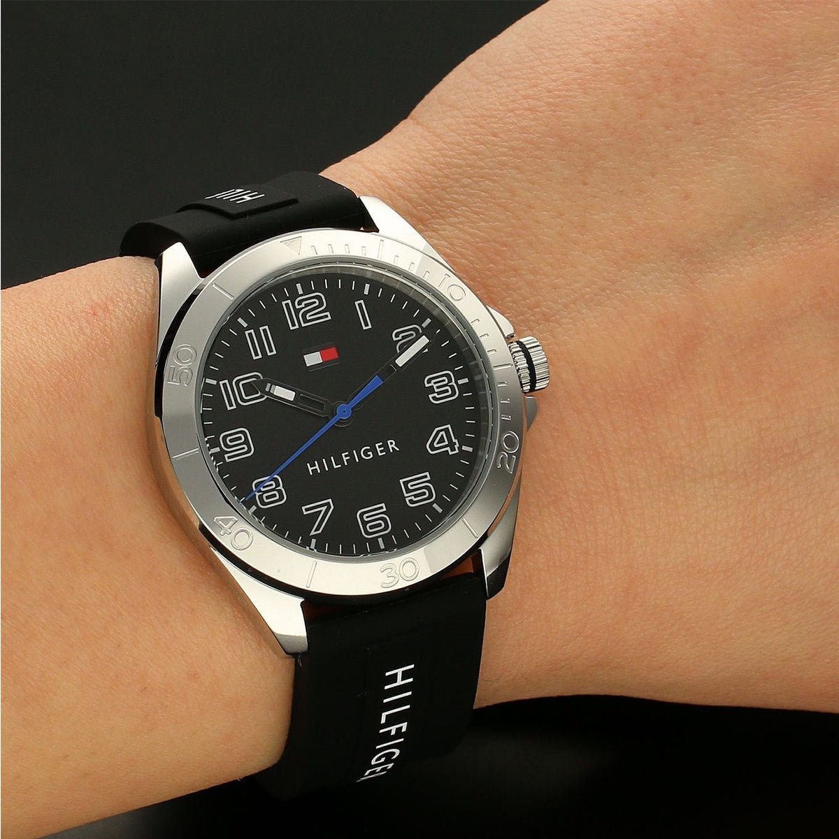 The Tommy Hilfiger Boys 172.0020 is a stylish children’s watch with a 34 mm wide stainless steel case in silver color. This model features a black silicone bracelet. The black dial of the Tommy Hilfiger 172.0020 is protected by a mineral glass. The watch is water resistant to 50m/5atm, which means it has limited water resistance (swimming is not recommended).