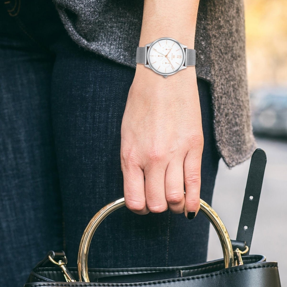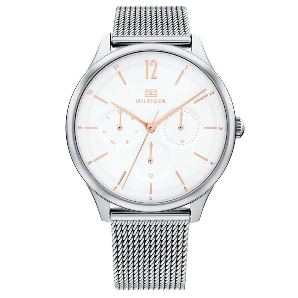 Women’s Chronograph Watch from the Layla Collection By Tommy Hilfiger. Chronograph Watch With Round Case Of Size 38Mm Of Silver Color Made Of Silver Steel. The dial is white. The glass is mineral. The strap is in silver-colored mesh steel. Functions: Multifunction. The Resistance to Water is 3 Atm. The reference is 1782456.